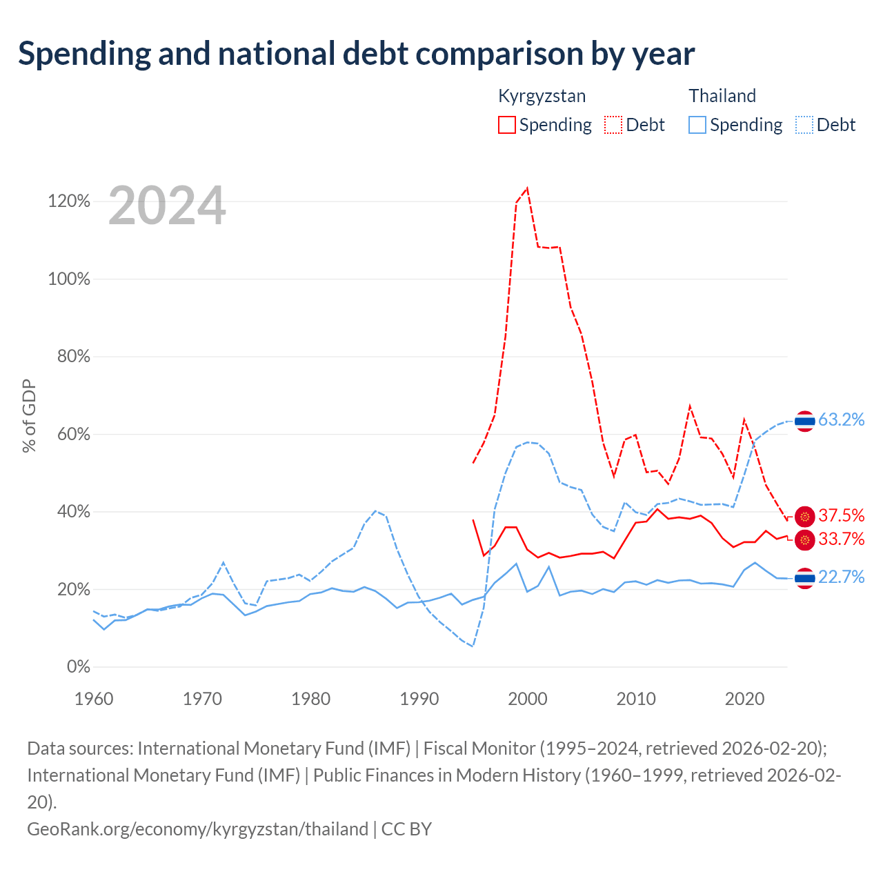 Kyrgyzstan has $6.56B in government debt (37.5% of GDP), compared to $333B (63.2% of GDP) in Thailand.