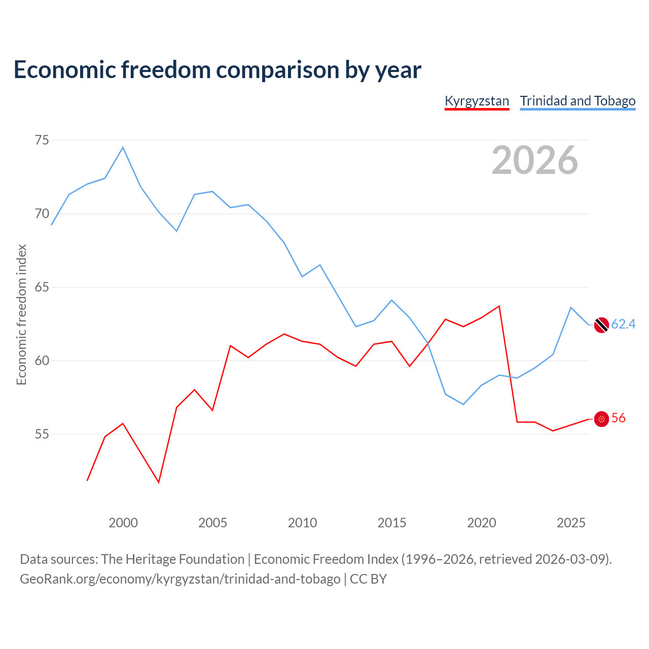The Economic Freedom Index for Kyrgyzstan is 56, ranking 126/197, compared to 62.4 for Trinidad and Tobago, ranking 87/197. The chart above displays a comparison of annual changes in economic freedom indexes.