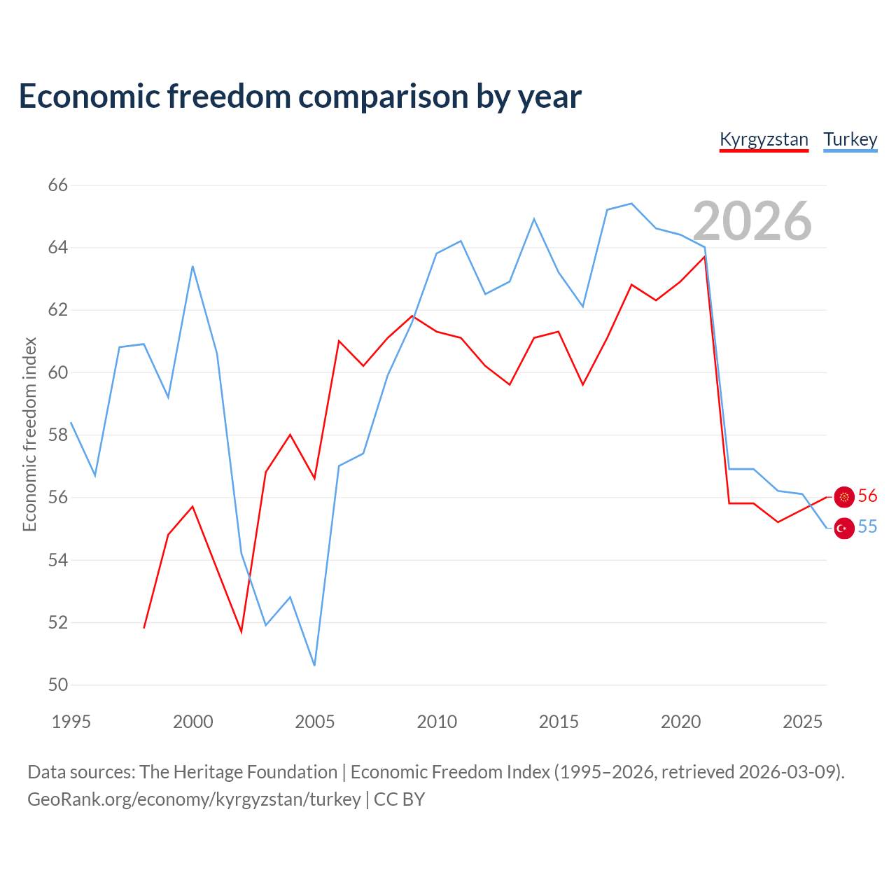 The Economic Freedom Index for Kyrgyzstan is 56, ranking 126/197, compared to 55 for Turkey, ranking 129/197. The chart above displays a comparison of annual changes in economic freedom indexes.
