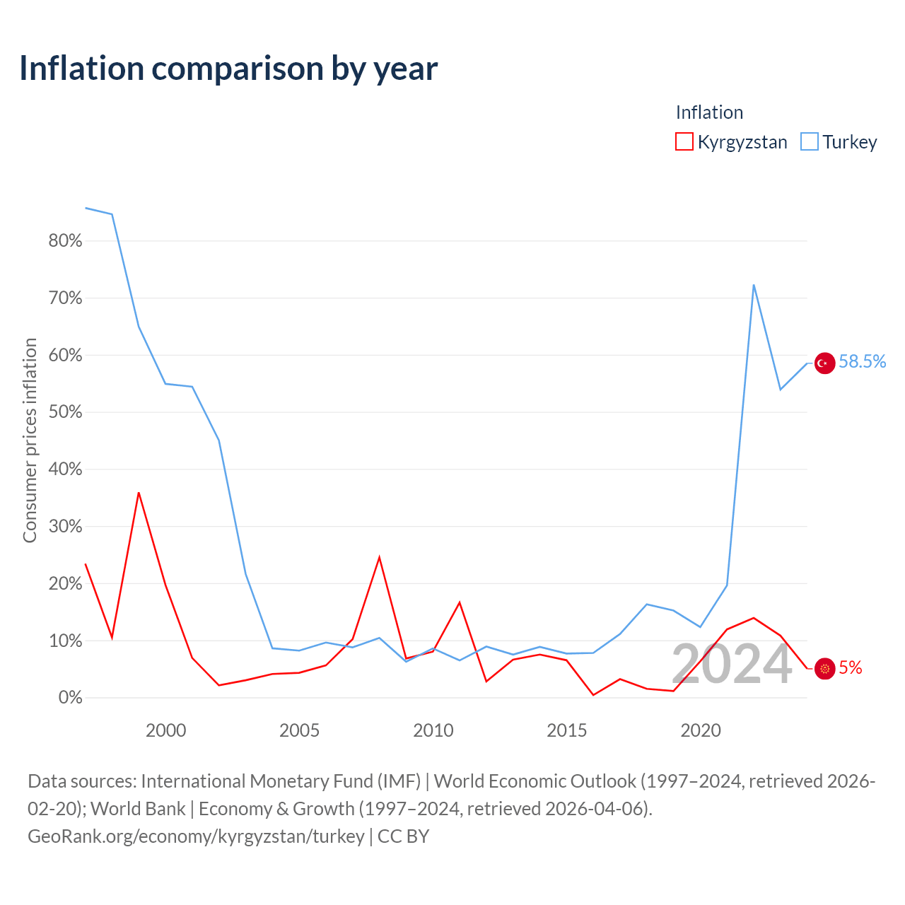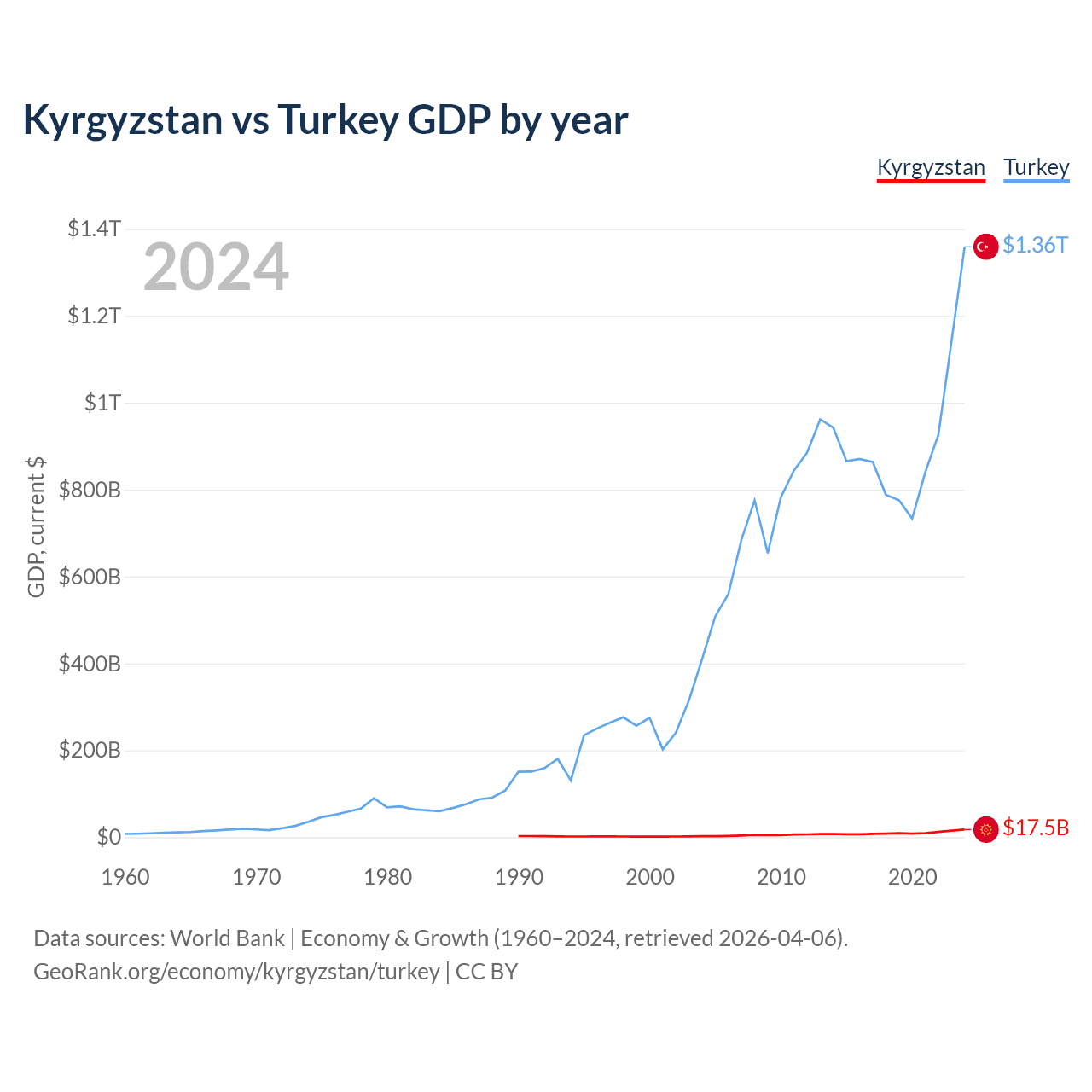 Kyrgyzstan has a GDP of $17.5B compared to $1.36T for Turkey, ranking 135/197 and 17/197 by economy size, respectively.