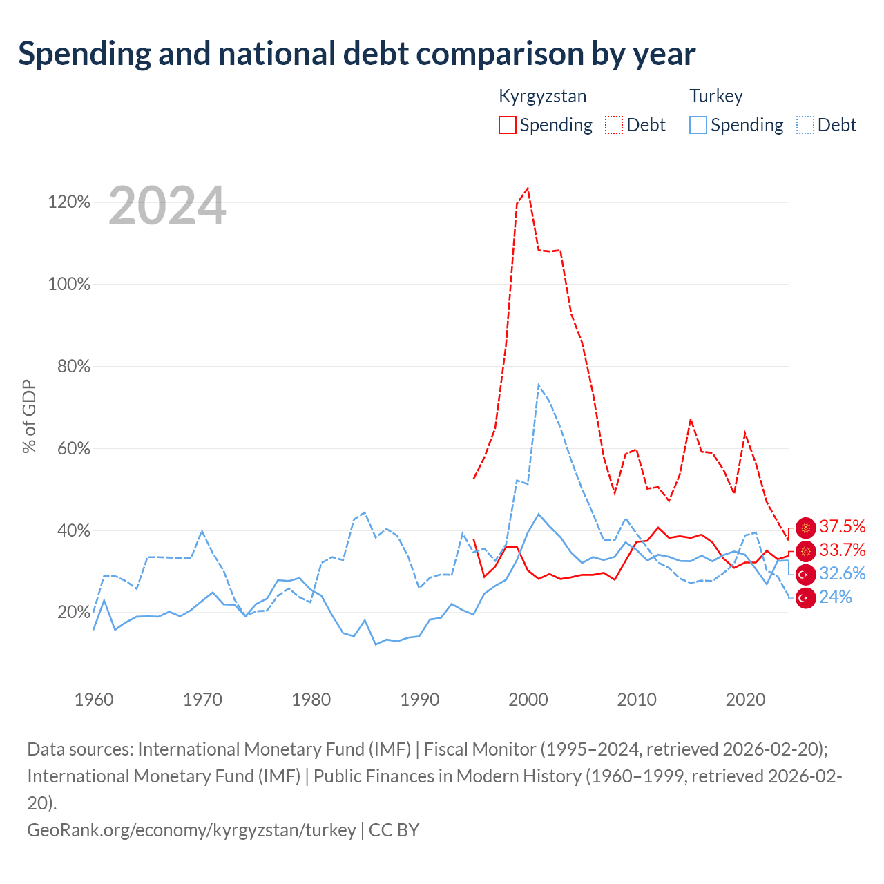 Kyrgyzstan has $6.56B in government debt (37.5% of GDP), compared to $327B (24% of GDP) in Turkey.