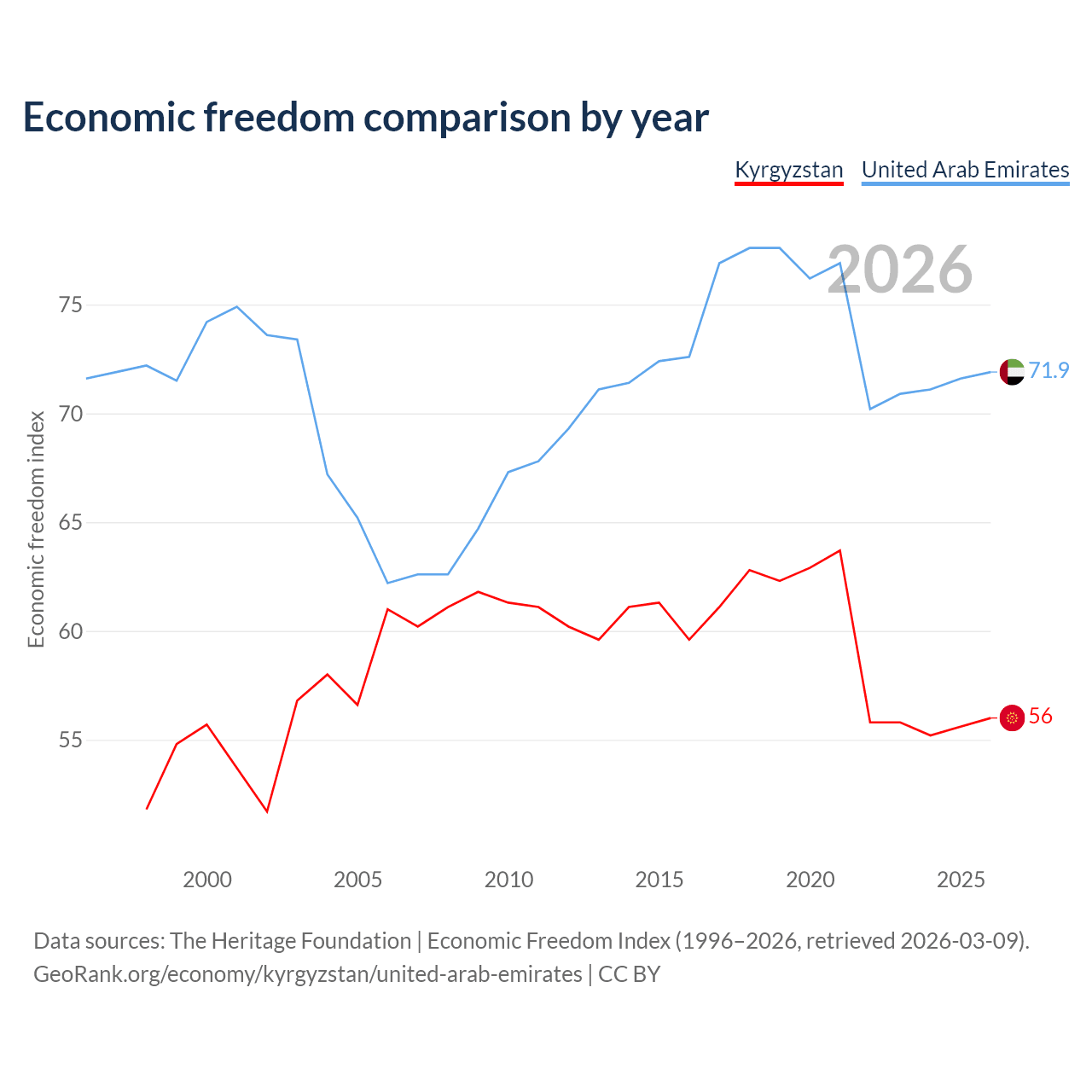 The Economic Freedom Index for Kyrgyzstan is 56, ranking 126/197, compared to 71.9 for the United Arab Emirates, ranking 29/197. The chart above displays a comparison of annual changes in economic freedom indexes.