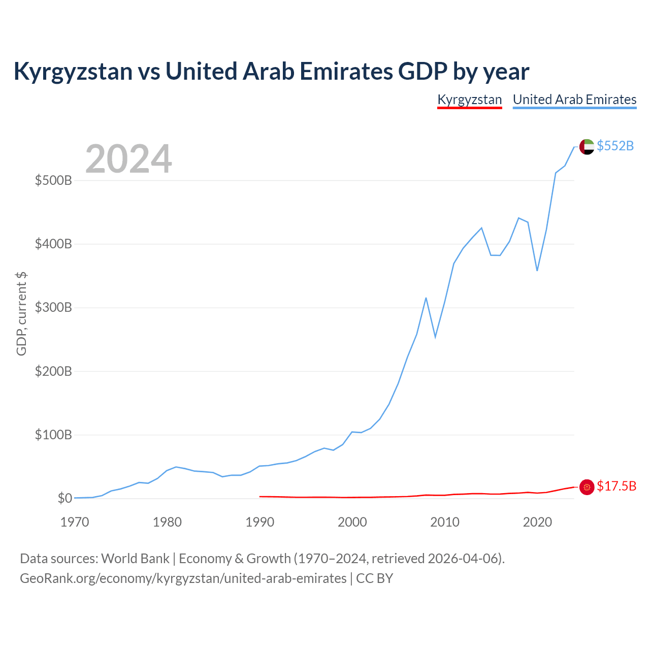 Kyrgyzstan has a GDP of $17.5B compared to $552B for the United Arab Emirates, ranking 135/197 and 27/197 by economy size, respectively.