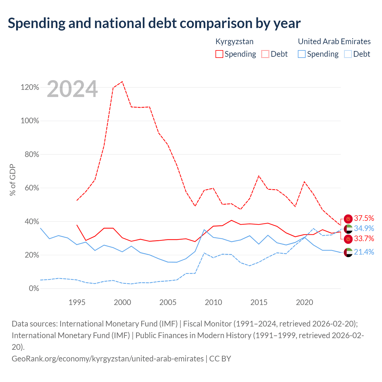 Kyrgyzstan has $6.56B in government debt (37.5% of GDP), compared to $193B (34.9% of GDP) in the United Arab Emirates.