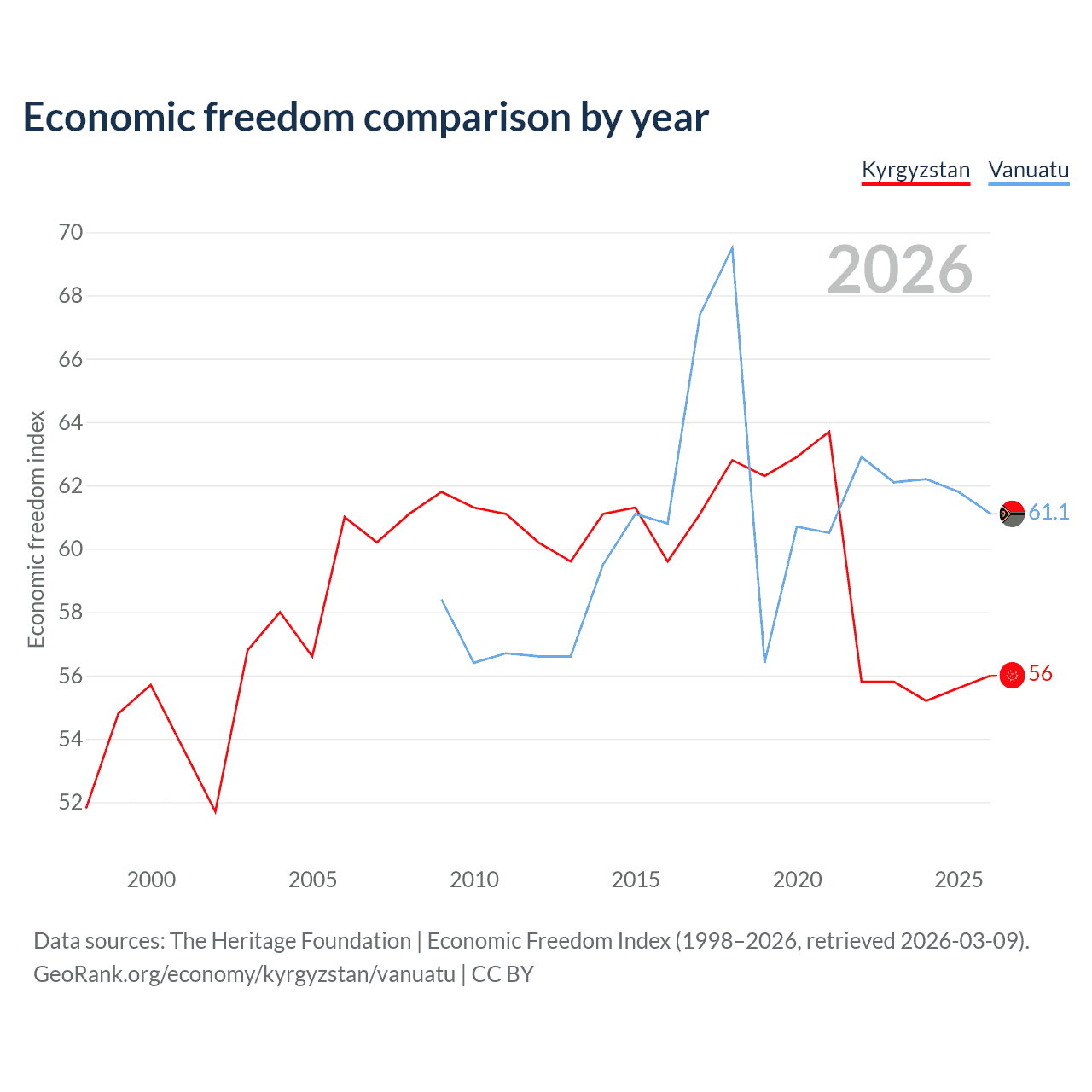 The Economic Freedom Index for Kyrgyzstan is 56, ranking 126/197, compared to 61.1 for Vanuatu, ranking 92/197. The chart above displays a comparison of annual changes in economic freedom indexes.