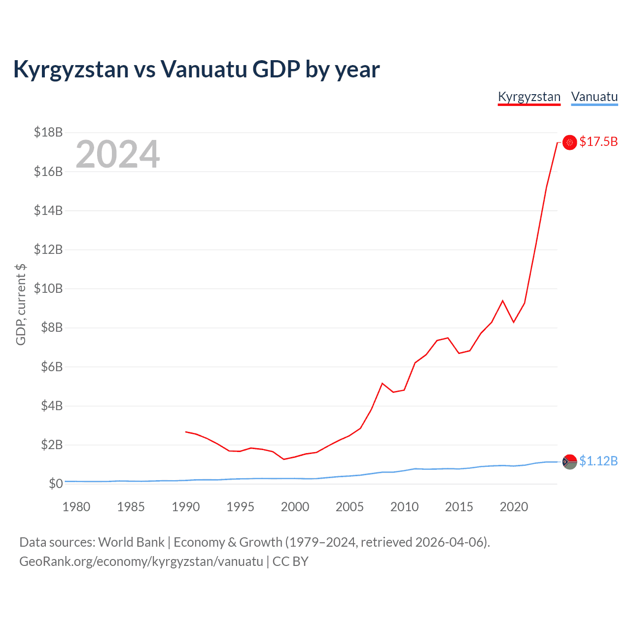 Kyrgyzstan has a GDP of $17.5B compared to $1.12B for Vanuatu, ranking 135/197 and 188/197 by economy size, respectively.