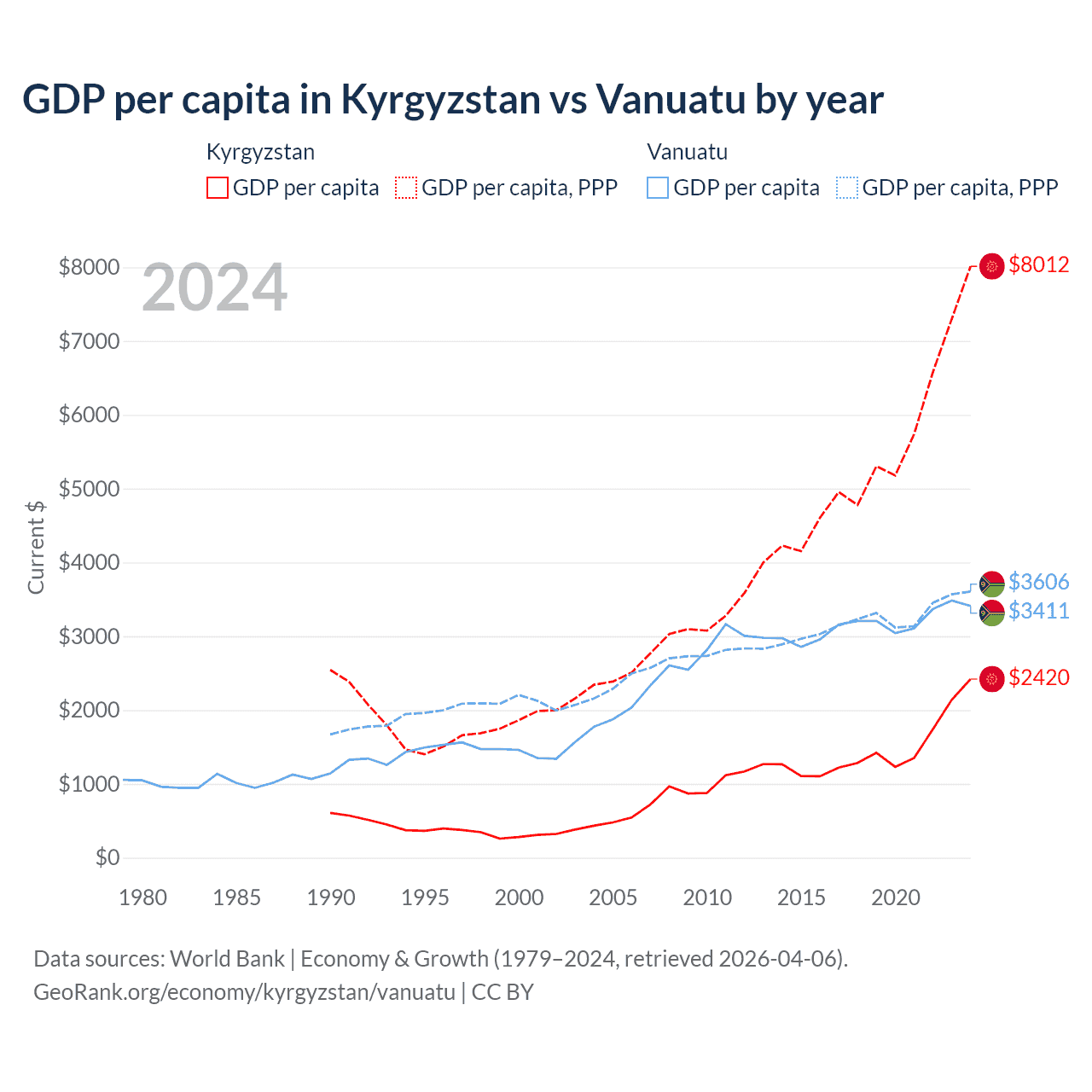 GDP per capita in Kyrgyzstan vs Vanuatu by year