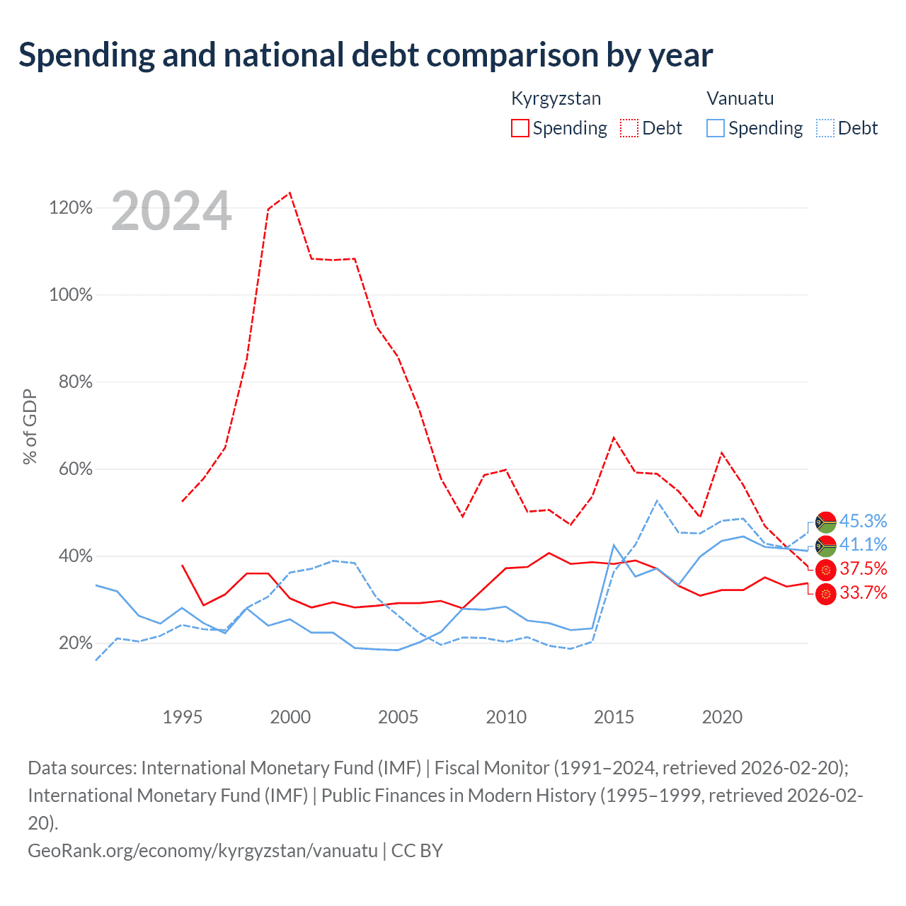 Kyrgyzstan has $6.56B in government debt (37.5% of GDP), compared to $507M (45.3% of GDP) in Vanuatu.