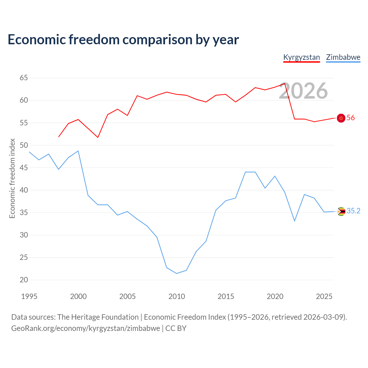 The Economic Freedom Index for Kyrgyzstan is 56, ranking 126/197, compared to 35.2 for Zimbabwe, ranking 190/197. The chart above displays a comparison of annual changes in economic freedom indexes.