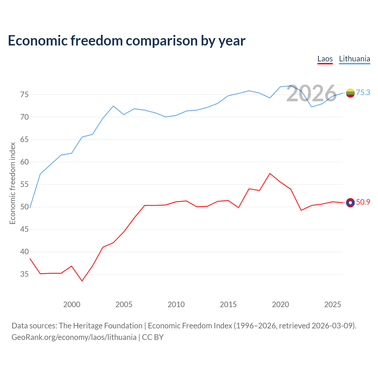 The Economic Freedom Index for Laos is 50.9, ranking 157/197, compared to 75.3 for Lithuania, ranking 18/197. The chart above displays a comparison of annual changes in economic freedom indexes.
