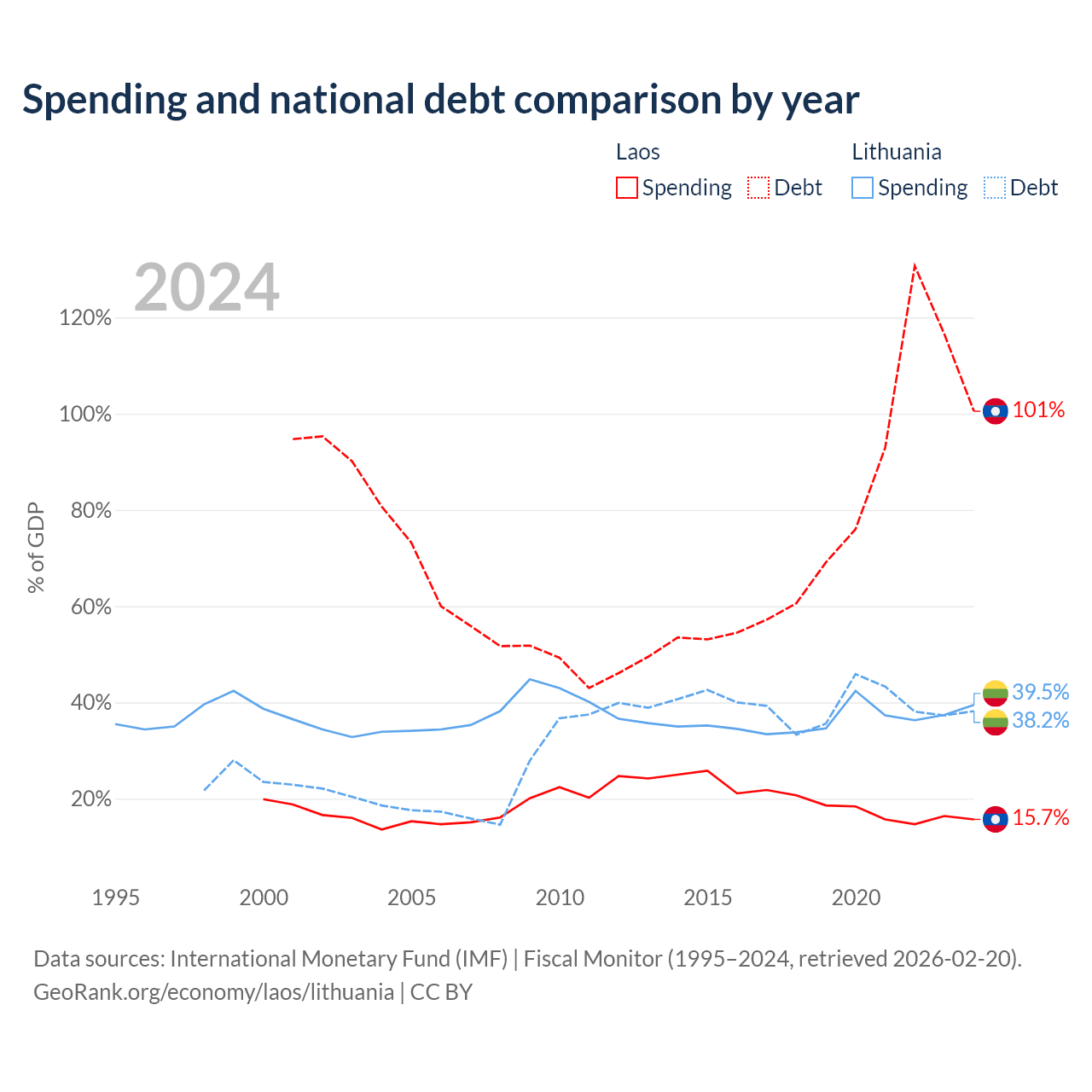 Laos has $16.6B in government debt (100.5% of GDP), compared to $32.4B (38.2% of GDP) in Lithuania.