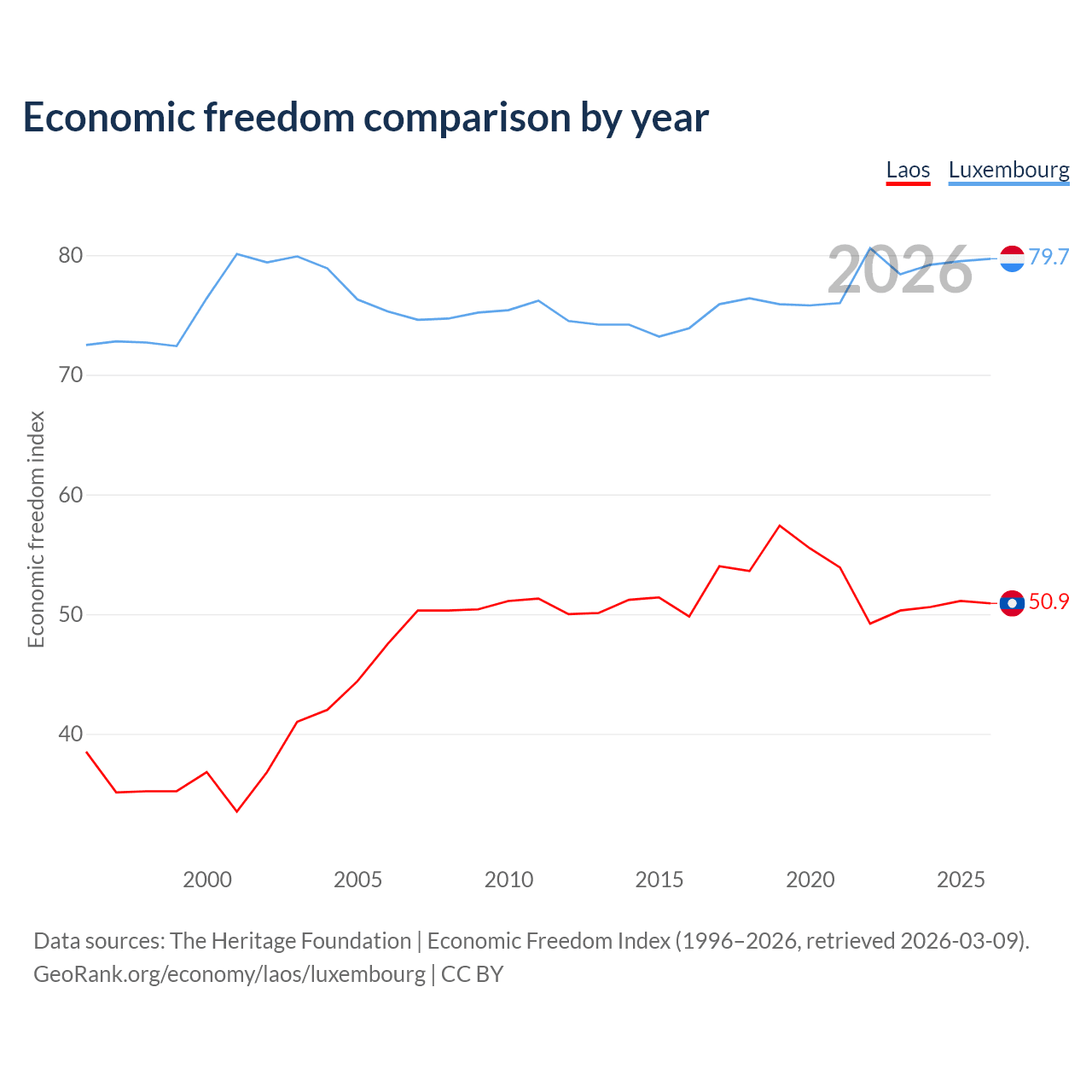 The Economic Freedom Index for Laos is 50.9, ranking 157/197, compared to 79.7 for Luxembourg, ranking 7/197. The chart above displays a comparison of annual changes in economic freedom indexes.