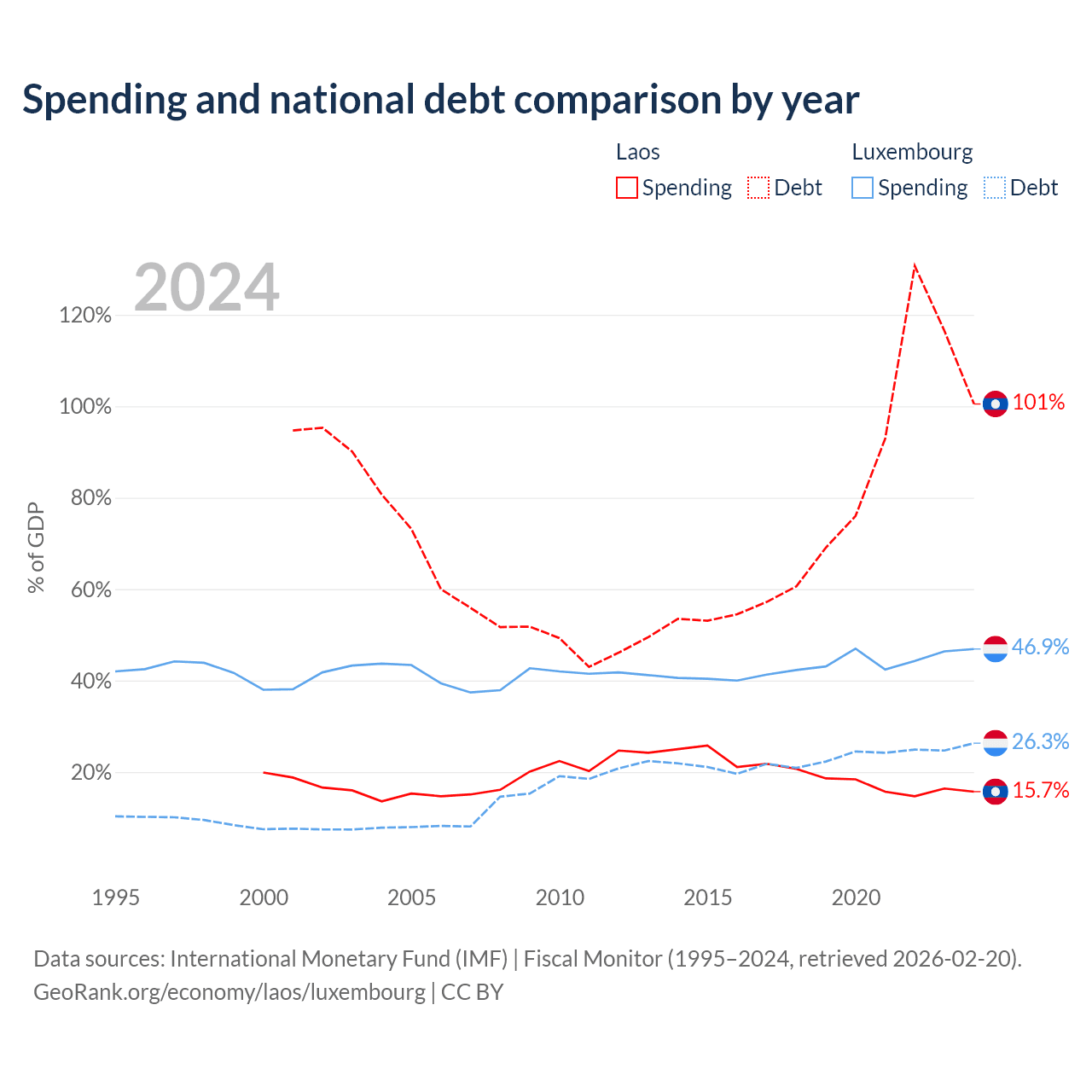 Laos has $16.6B in government debt (100.5% of GDP), compared to $24.5B (26.3% of GDP) in Luxembourg.