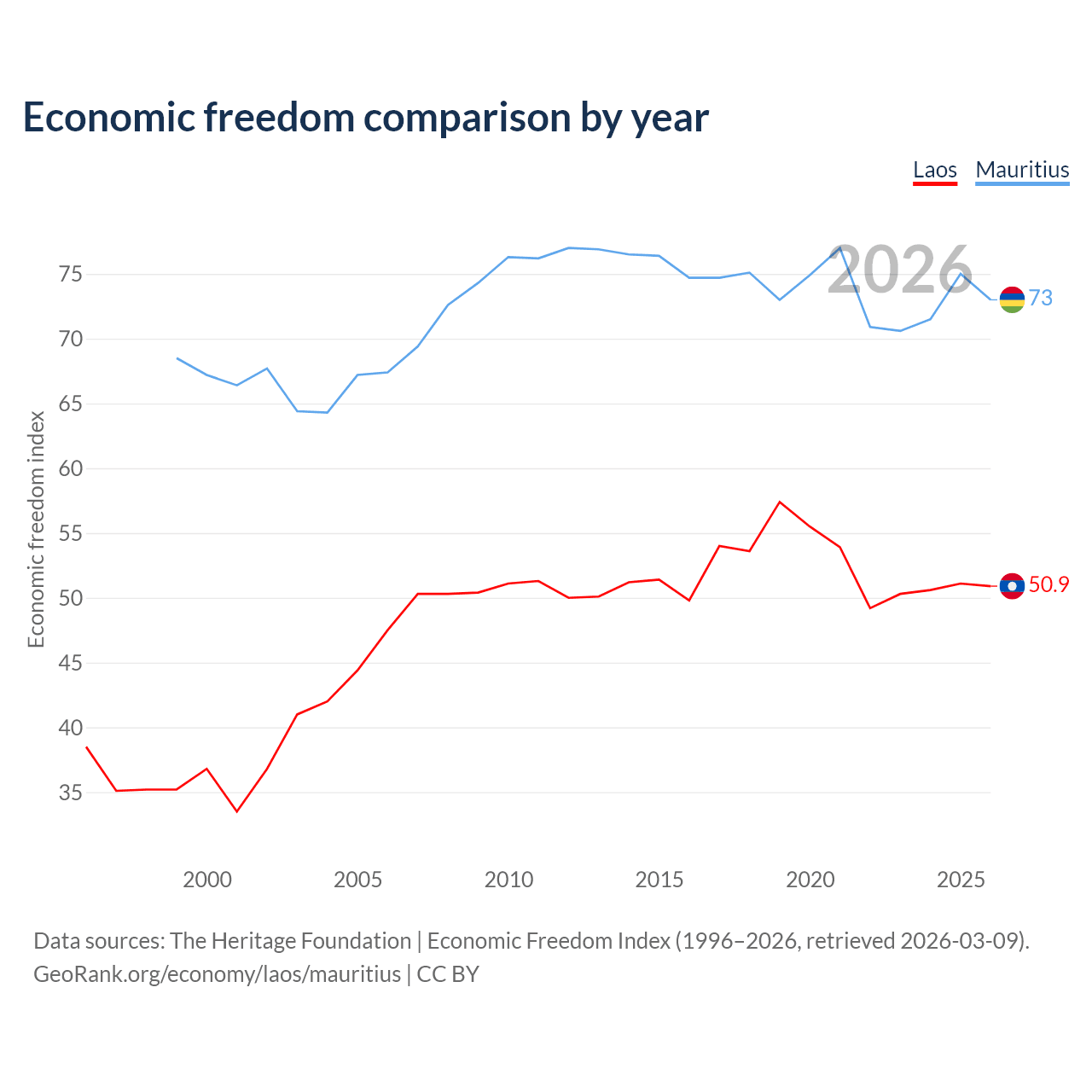 The Economic Freedom Index for Laos is 50.9, ranking 157/197, compared to 73 for Mauritius, ranking 26/197. The chart above displays a comparison of annual changes in economic freedom indexes.