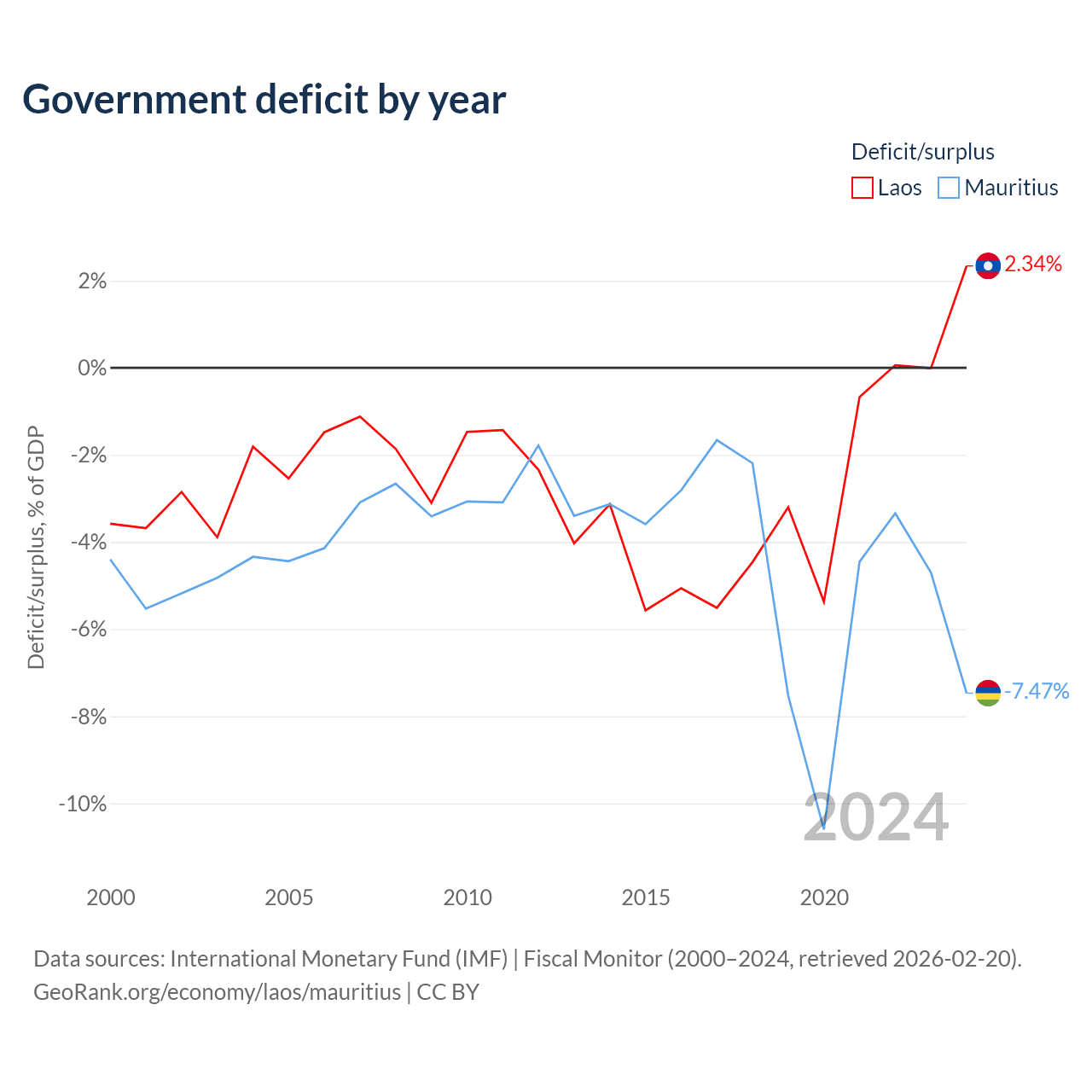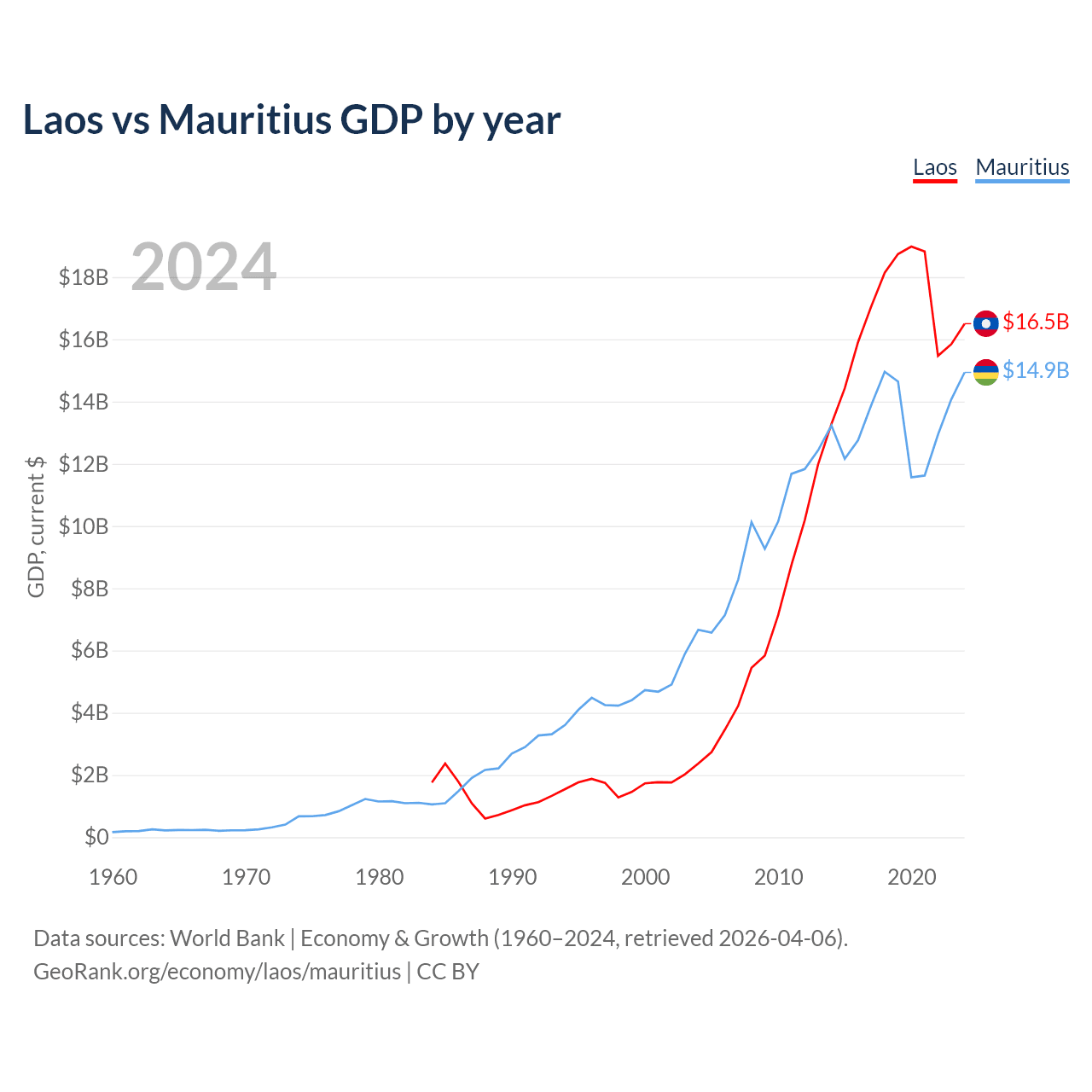 Laos has a GDP of $16.5B compared to $14.9B for Mauritius, ranking 139/197 and 143/197 by economy size, respectively.