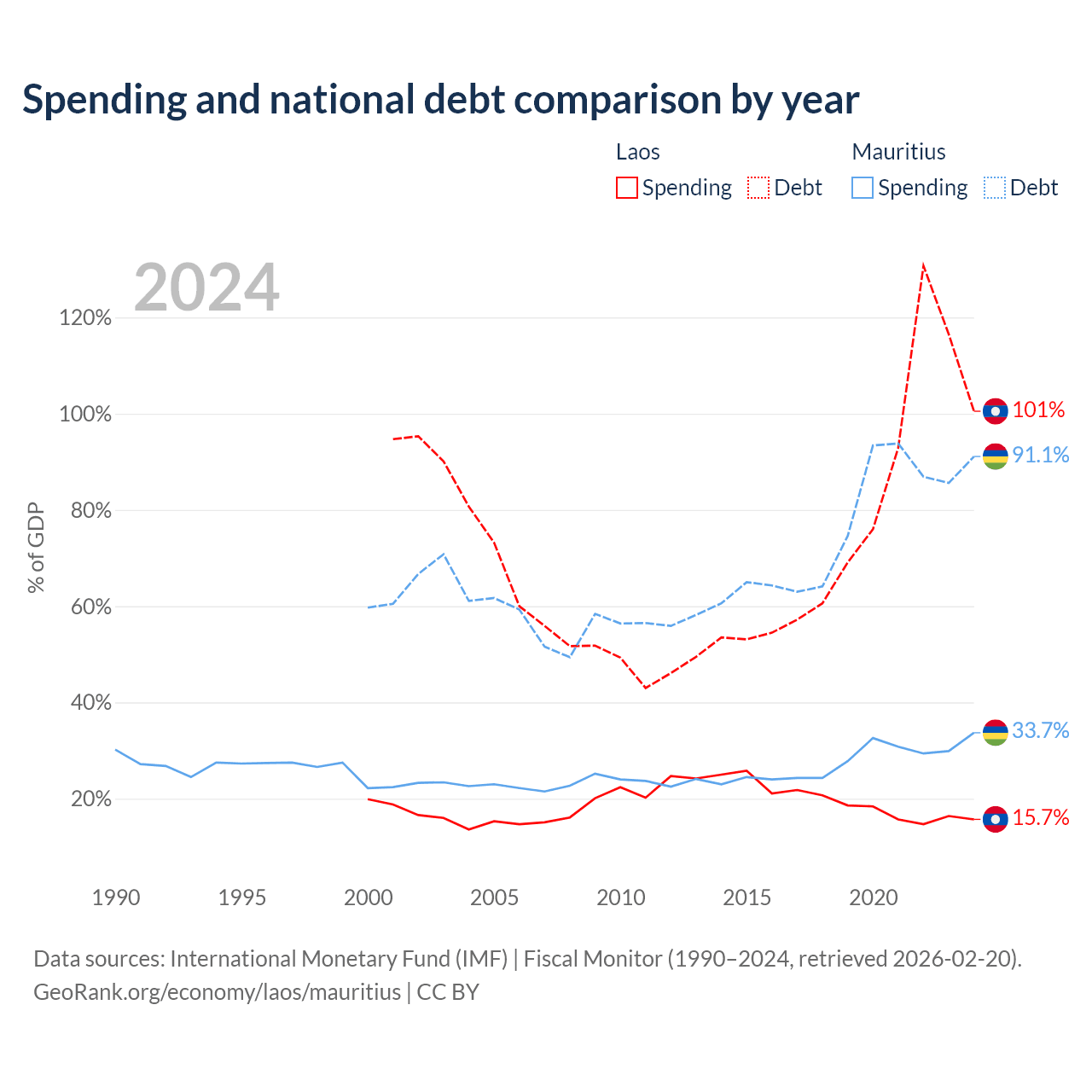 Laos has $16.6B in government debt (100.5% of GDP), compared to $13.6B (91.1% of GDP) in Mauritius.