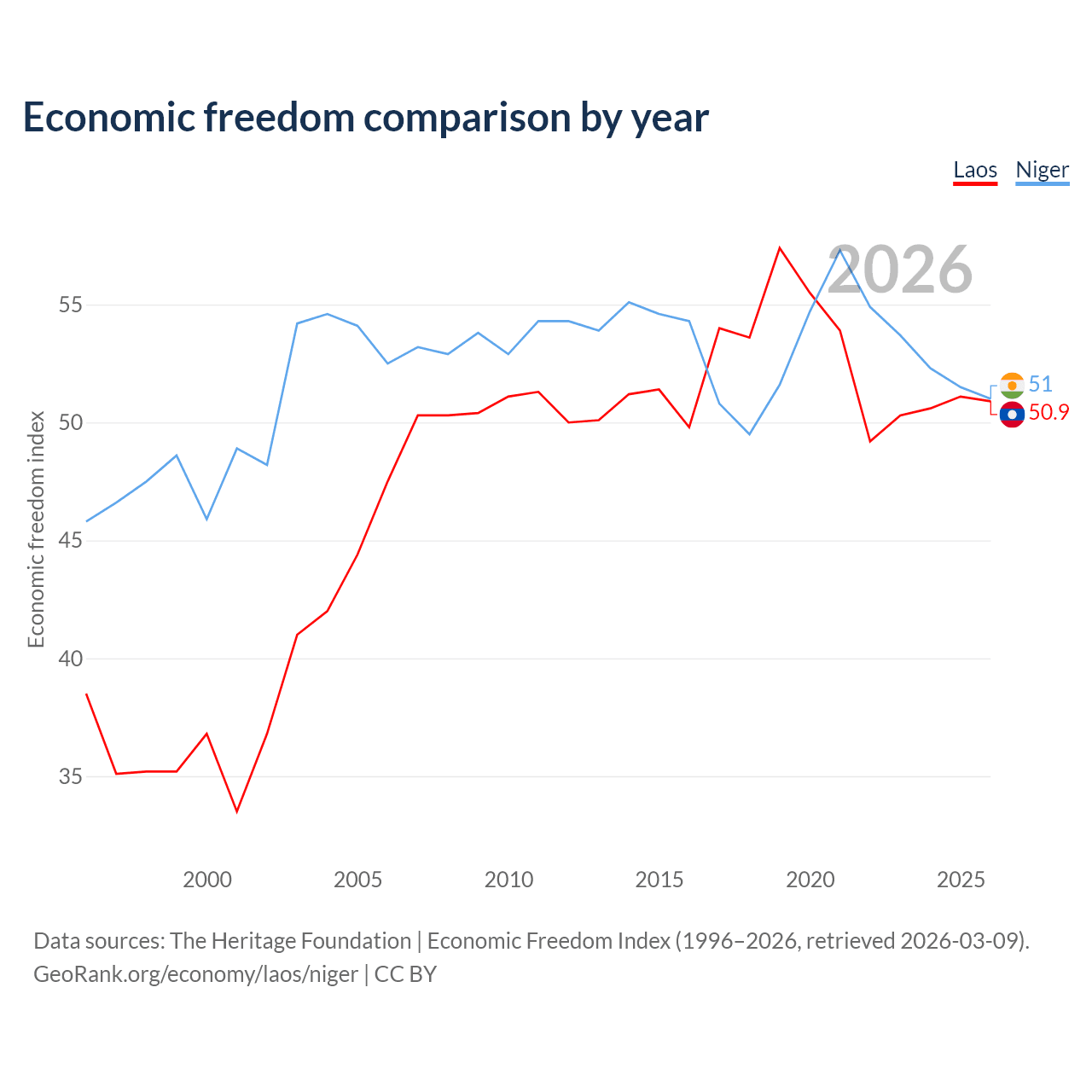 The Economic Freedom Index for Laos is 50.9, ranking 157/197, compared to 51 for Niger, ranking 156/197. The chart above displays a comparison of annual changes in economic freedom indexes.