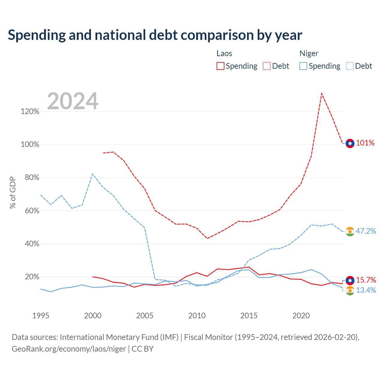 Laos has $16.6B in government debt (100.5% of GDP), compared to $9.39B (47.2% of GDP) in Niger.