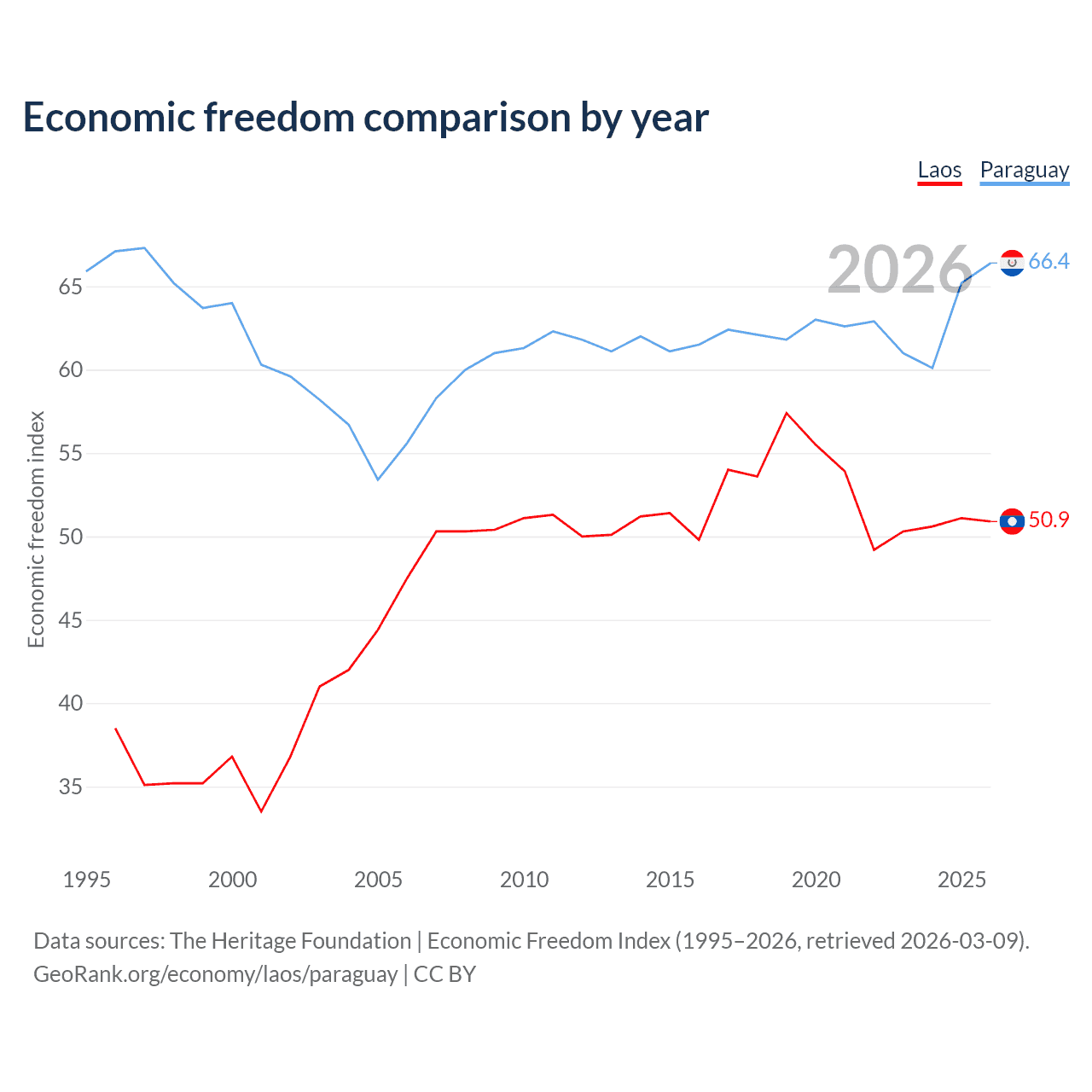The Economic Freedom Index for Laos is 50.9, ranking 157/197, compared to 66.4 for Paraguay, ranking 61/197. The chart above displays a comparison of annual changes in economic freedom indexes.