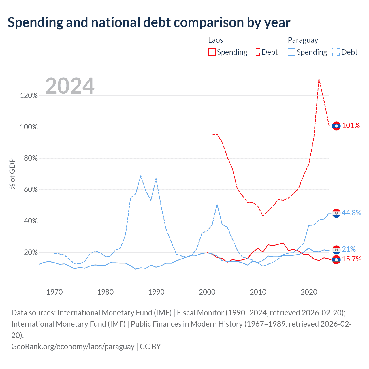 Laos has $16.6B in government debt (100.5% of GDP), compared to $19.9B (44.8% of GDP) in Paraguay.