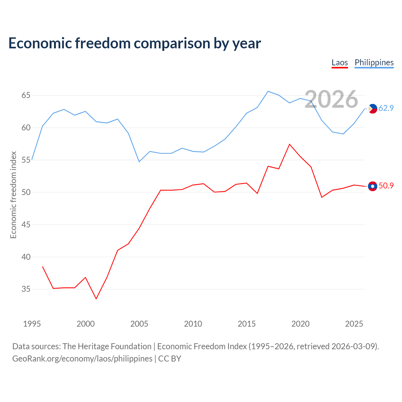 The Economic Freedom Index for Laos is 50.9, ranking 157/197, compared to 62.9 for the Philippines, ranking 85/197. The chart above displays a comparison of annual changes in economic freedom indexes.