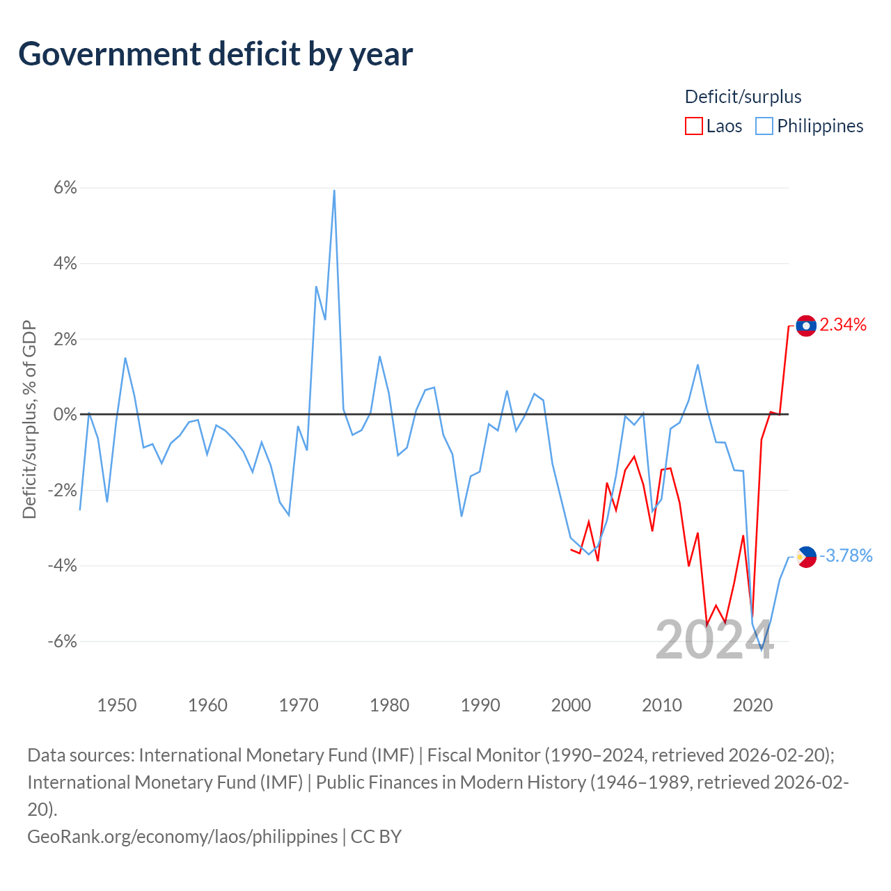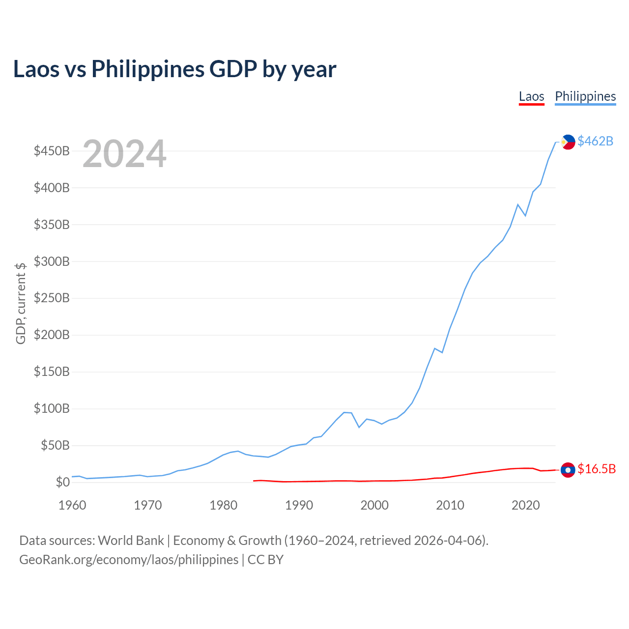 Laos has a GDP of $16.5B compared to $462B for the Philippines, ranking 139/197 and 35/197 by economy size, respectively.