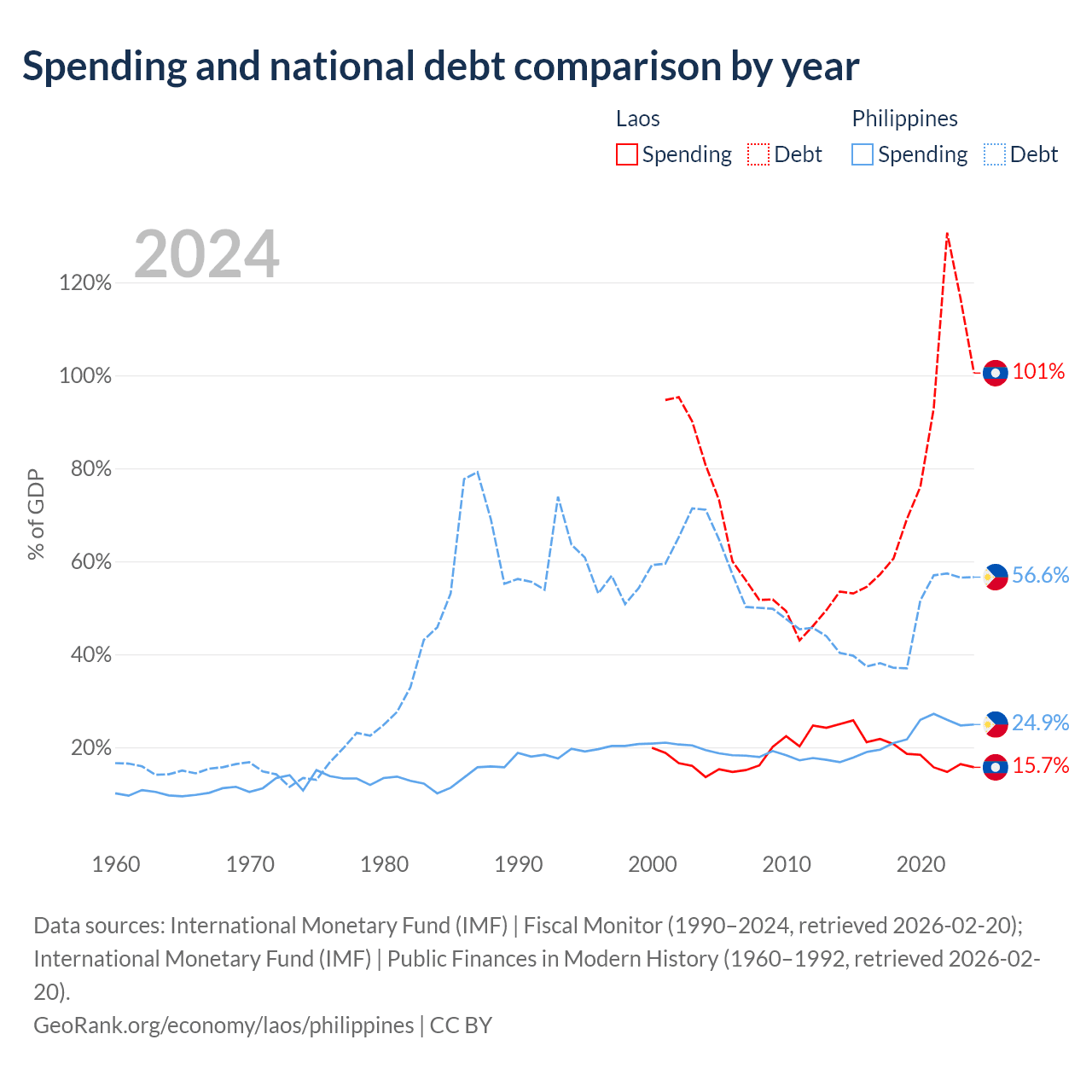 Laos has $16.6B in government debt (100.5% of GDP), compared to $261B (56.6% of GDP) in the Philippines.