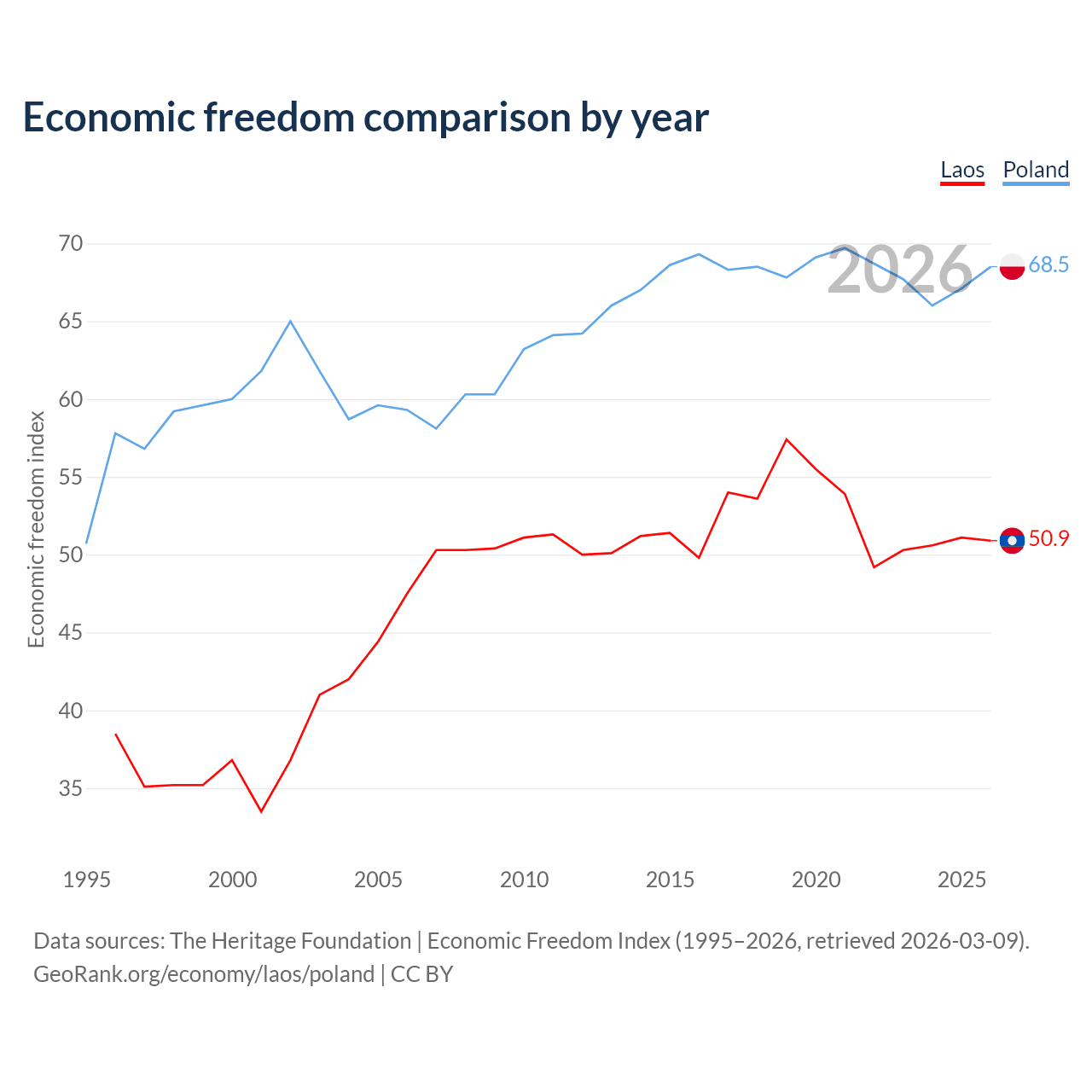 The Economic Freedom Index for Laos is 50.9, ranking 157/197, compared to 68.5 for Poland, ranking 46/197. The chart above displays a comparison of annual changes in economic freedom indexes.