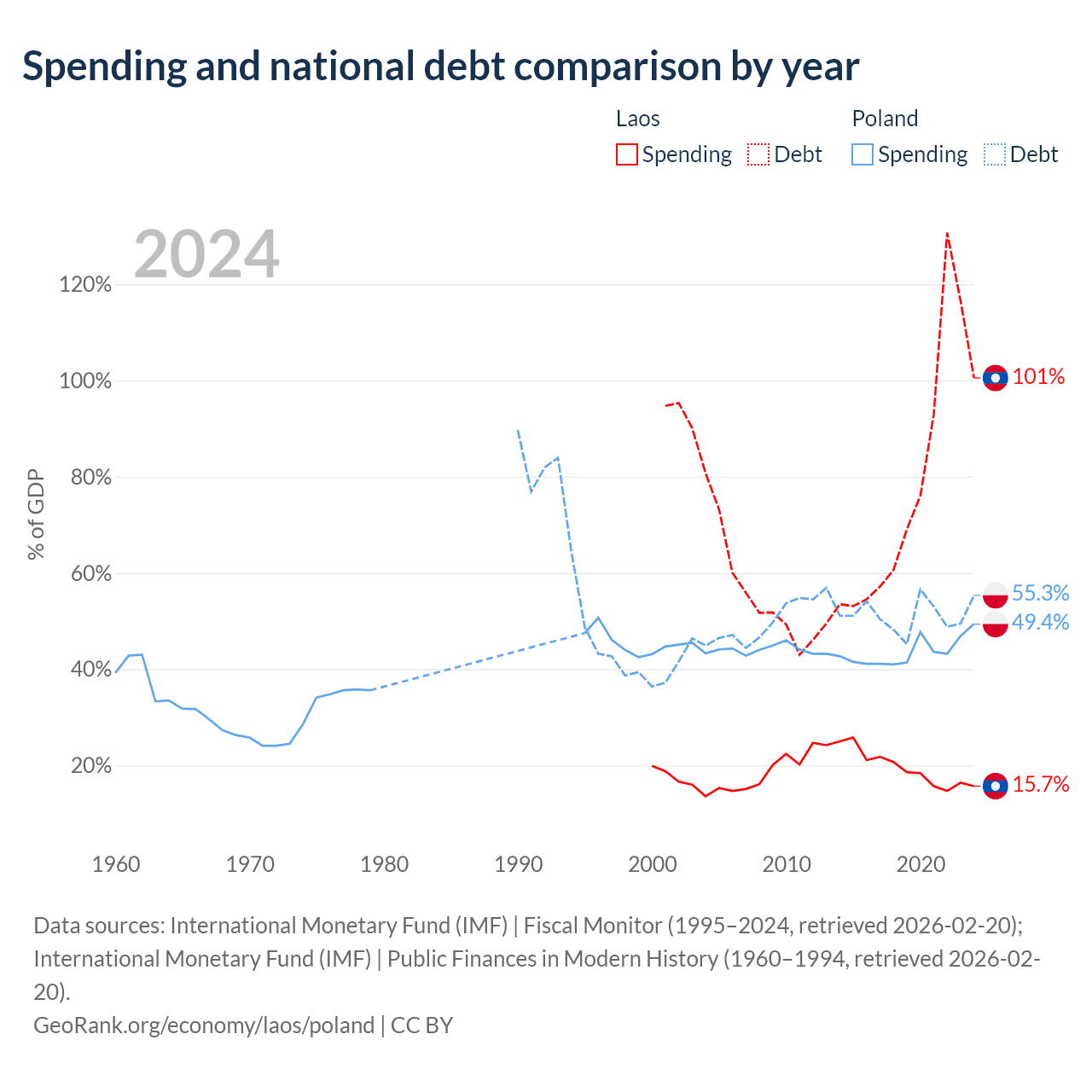 Laos has $16.6B in government debt (100.5% of GDP), compared to $507B (55.3% of GDP) in Poland.
