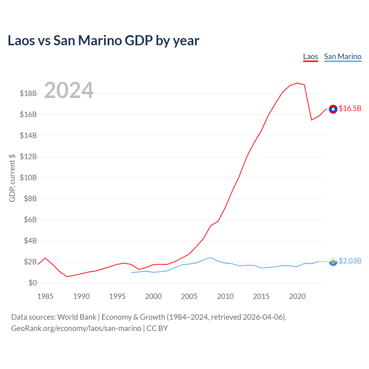 Laos has a GDP of $16.5B compared to $2.03B for San Marino, ranking 139/197 and 180/197 by economy size, respectively.