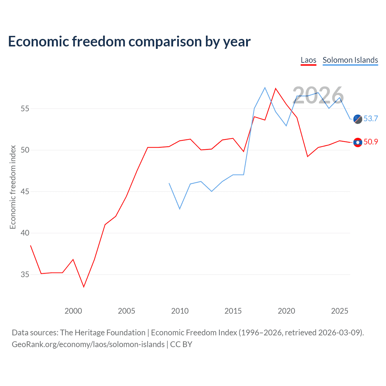 The Economic Freedom Index for Laos is 50.9, ranking 157/197, compared to 53.7 for the Solomon Islands, ranking 137/197. The chart above displays a comparison of annual changes in economic freedom indexes.