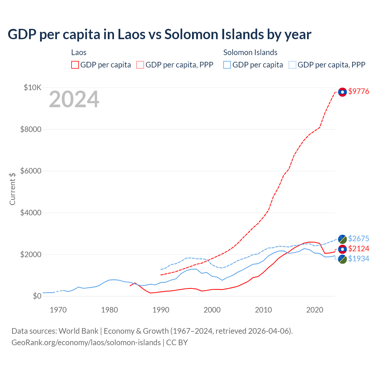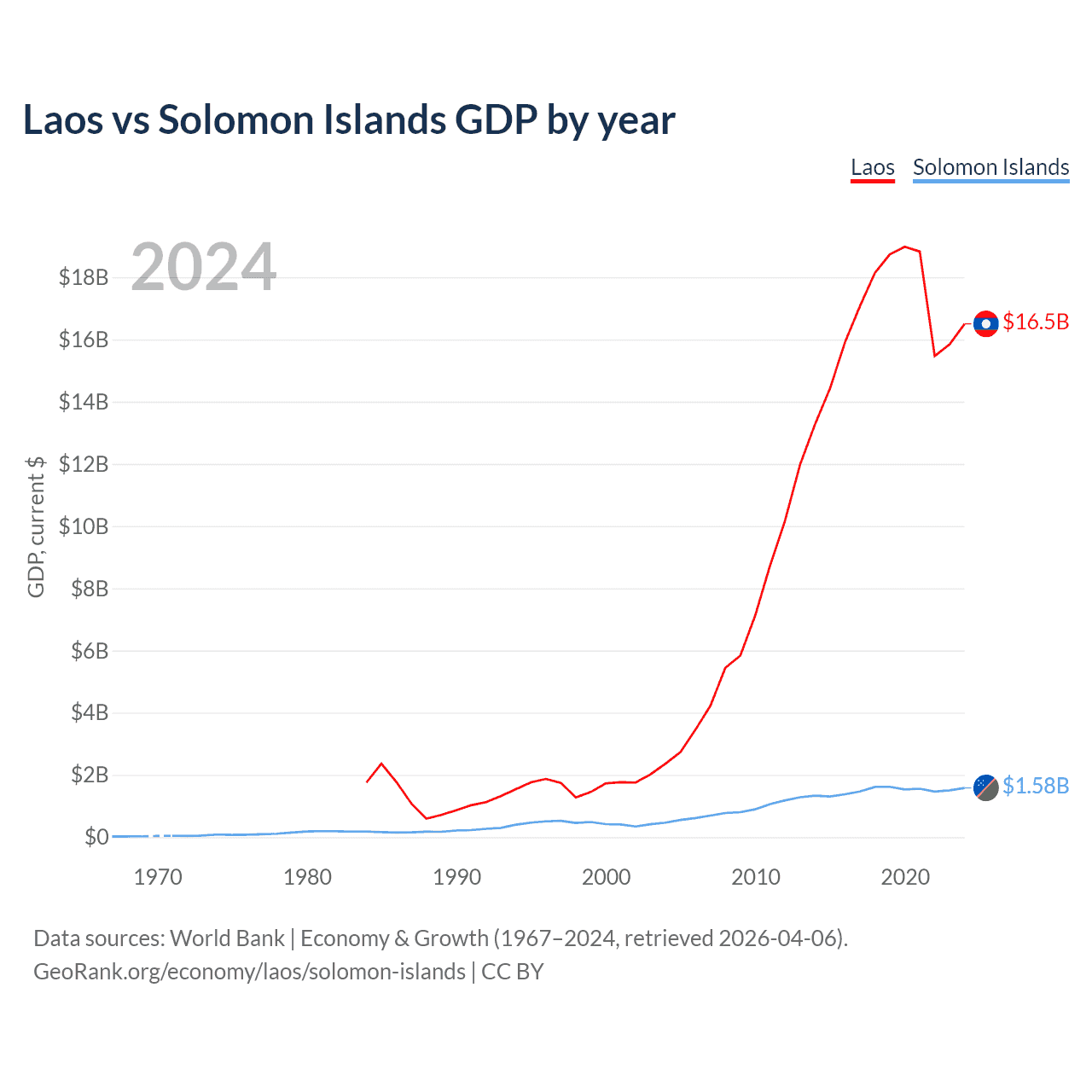 Laos has a GDP of $16.5B compared to $1.58B for the Solomon Islands, ranking 139/197 and 182/197 by economy size, respectively.