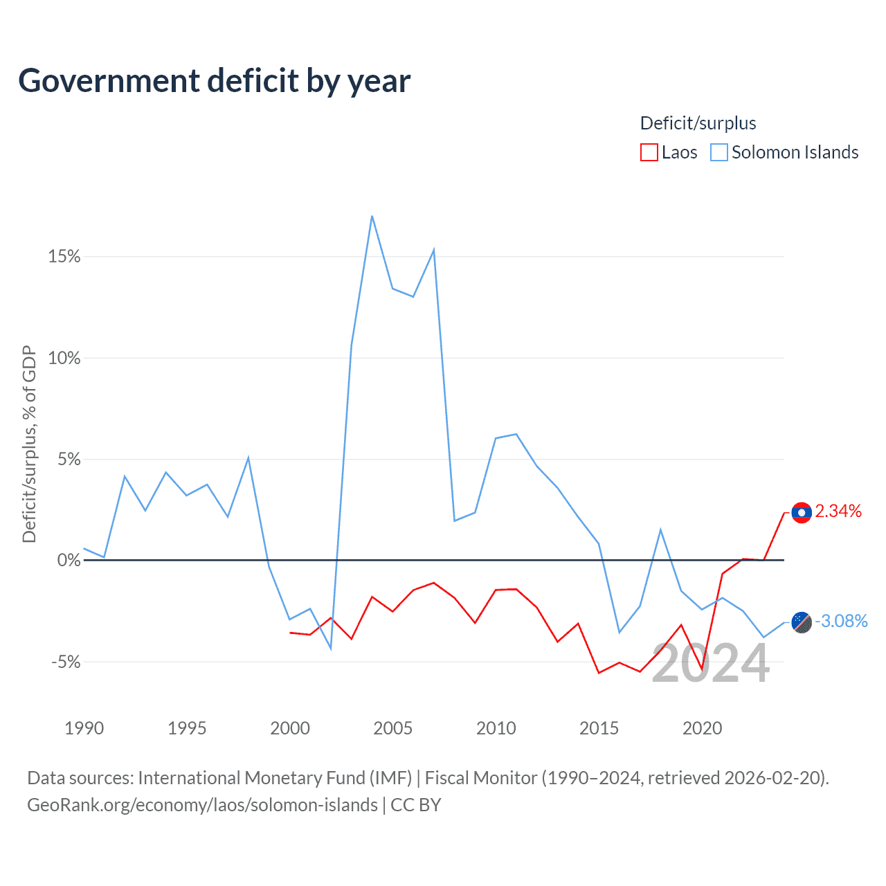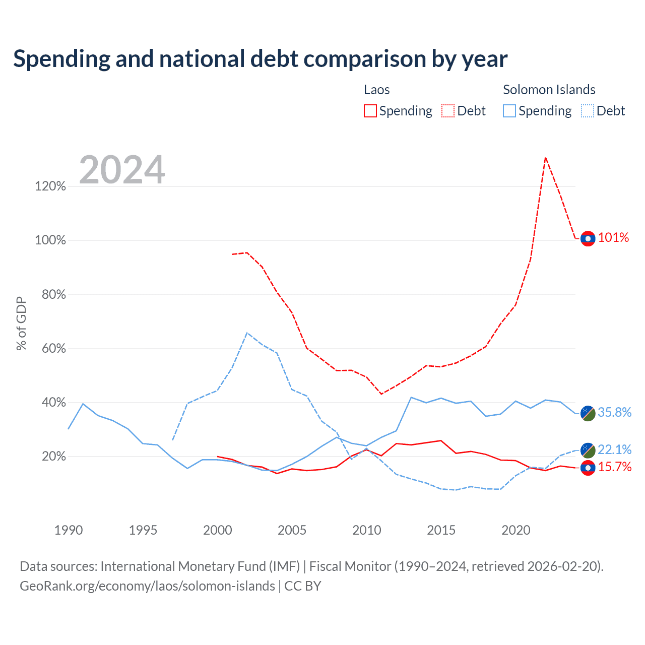 Laos has $16.6B in government debt (100.5% of GDP), compared to $350M (22.1% of GDP) in the Solomon Islands.