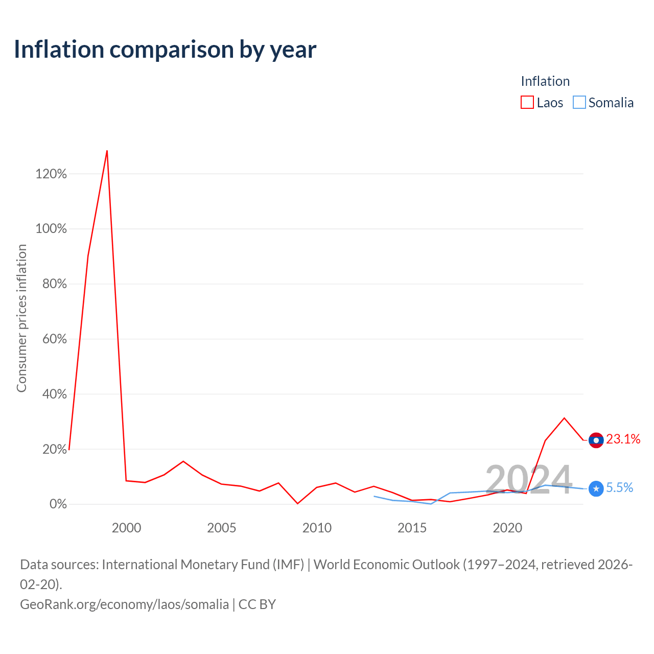 Over the past 12 years, Laos has recorded an average annual inflation rate of 8.81%, compared with 3.77% in Somalia. In 2024, inflation was 23.1% in Laos and 5.5% in Somalia.