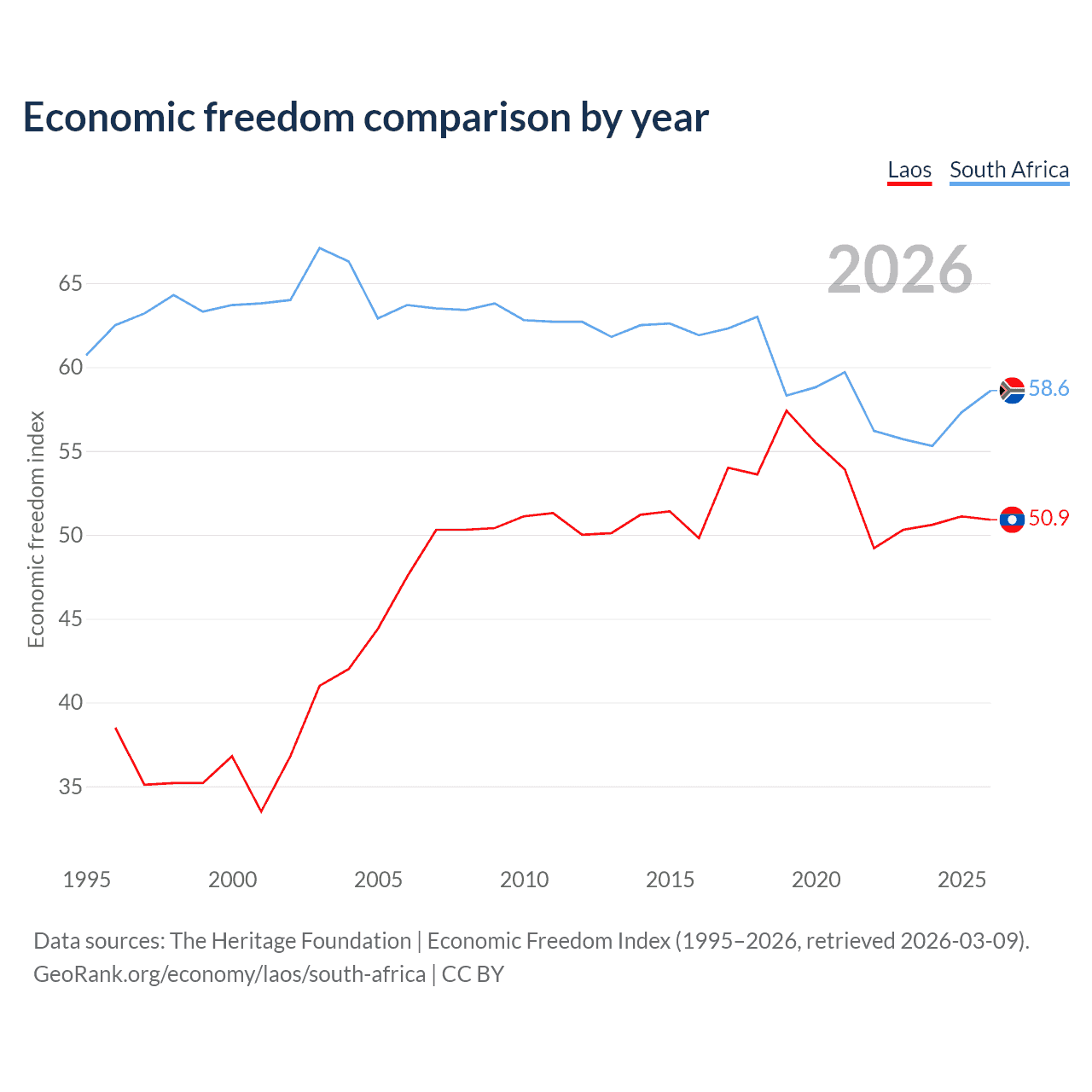 The Economic Freedom Index for Laos is 50.9, ranking 157/197, compared to 58.6 for South Africa, ranking 110/197. The chart above displays a comparison of annual changes in economic freedom indexes.