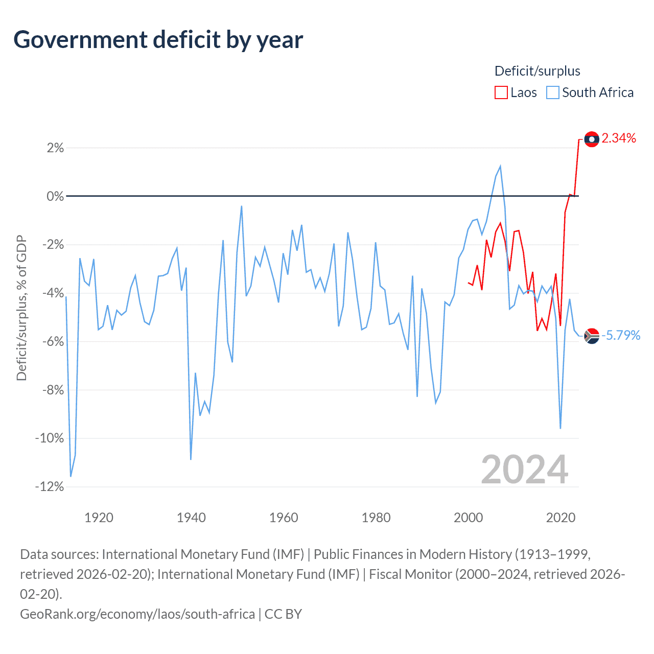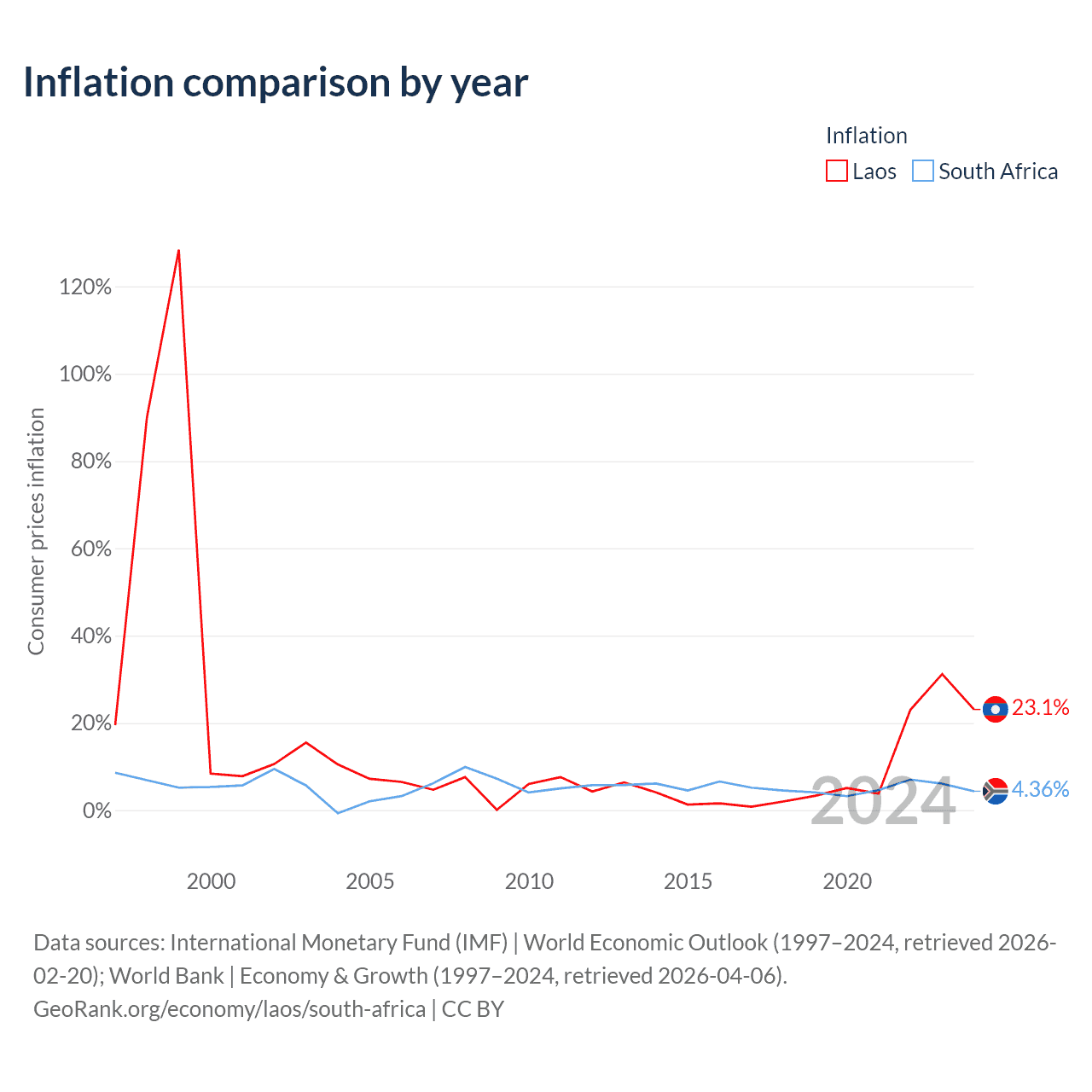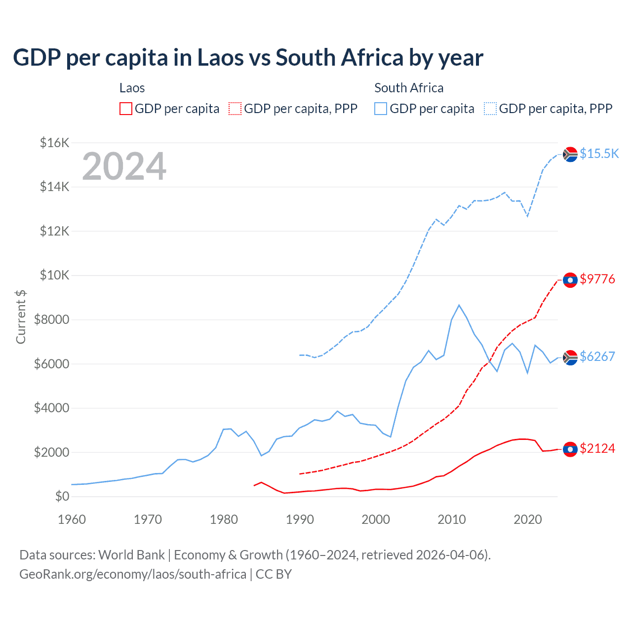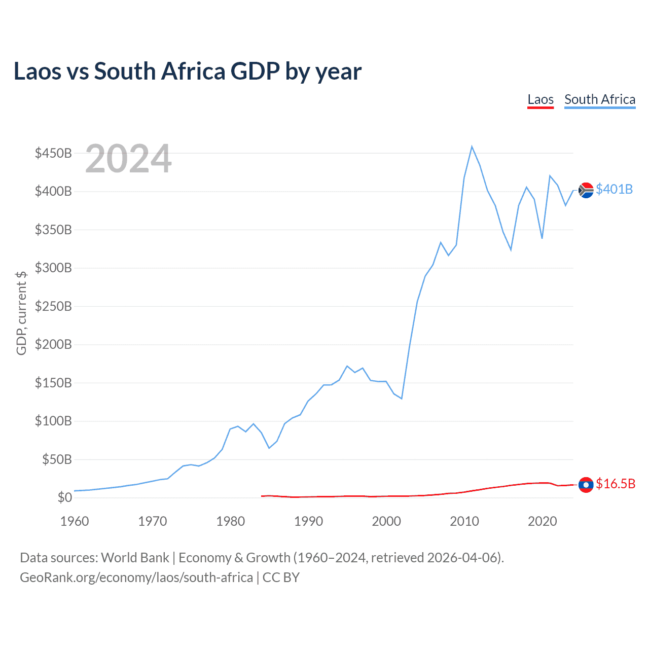 Laos has a GDP of $16.5B compared to $401B for South Africa, ranking 139/197 and 40/197 by economy size, respectively.