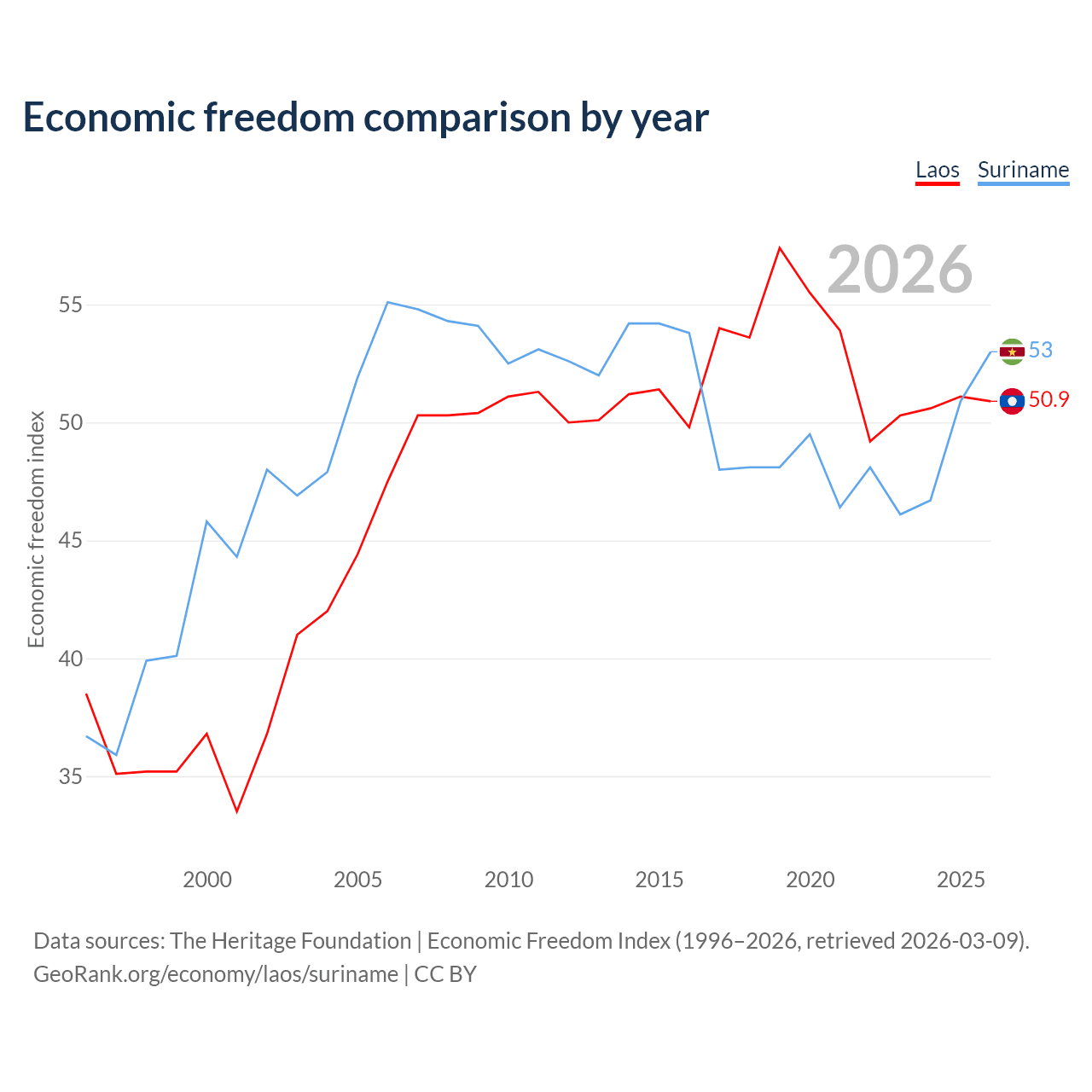 The Economic Freedom Index for Laos is 50.9, ranking 157/197, compared to 53 for Suriname, ranking 143/197. The chart above displays a comparison of annual changes in economic freedom indexes.