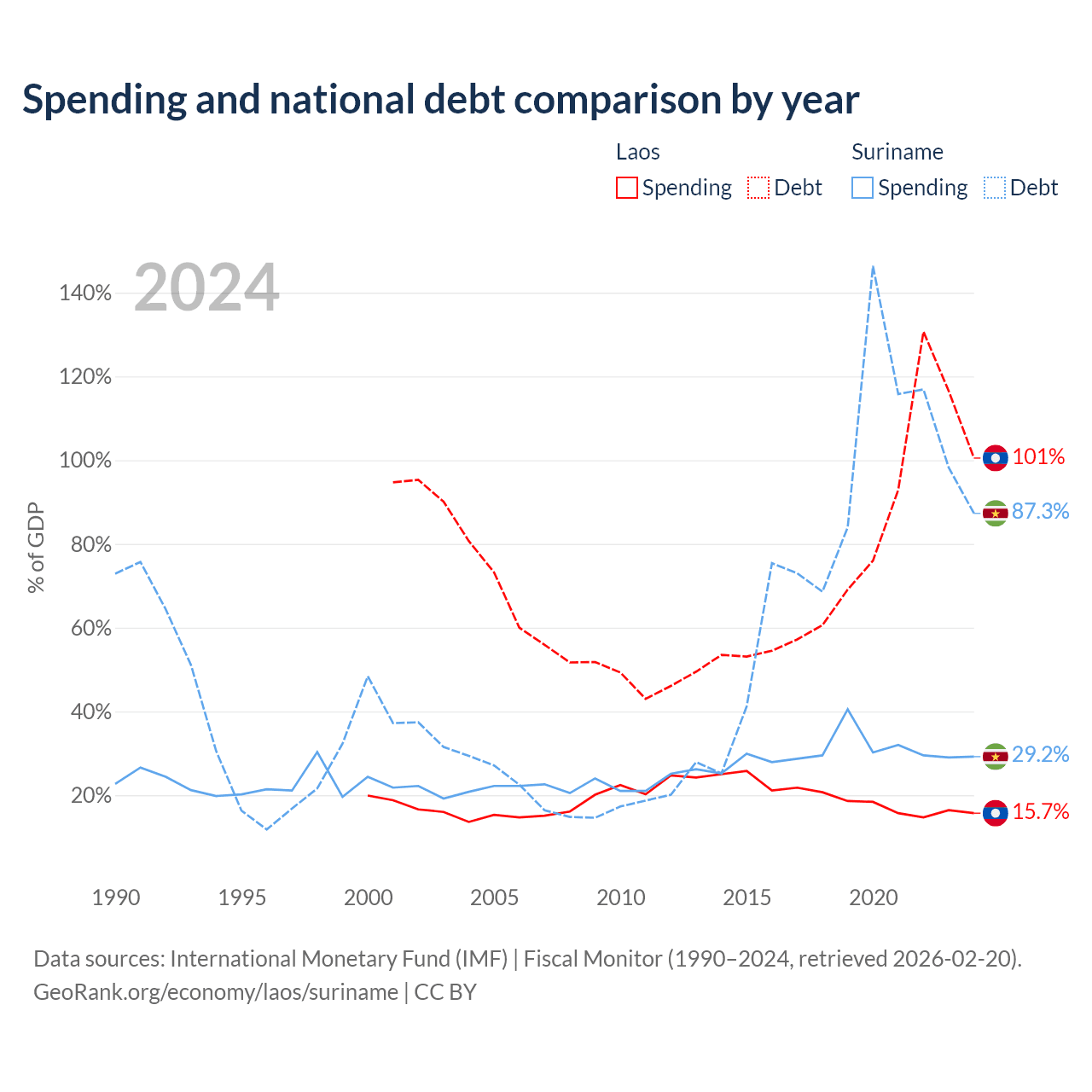 Laos has $16.6B in government debt (100.5% of GDP), compared to $3.86B (87.3% of GDP) in Suriname.