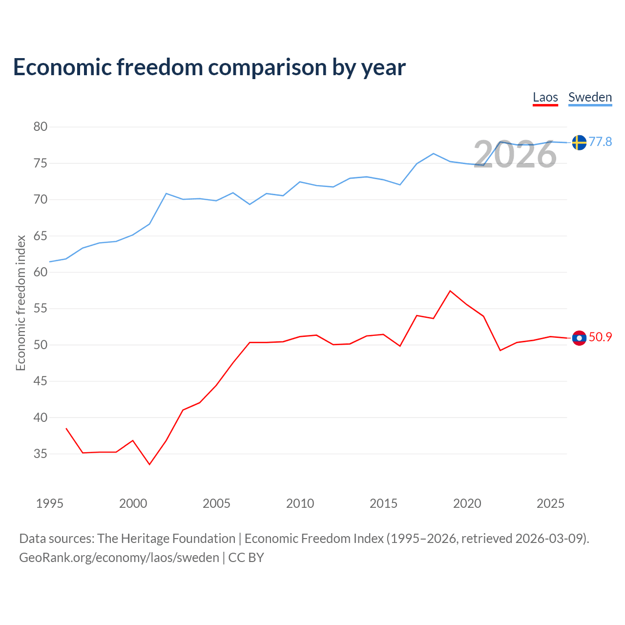 The Economic Freedom Index for Laos is 50.9, ranking 157/197, compared to 77.8 for Sweden, ranking 14/197. The chart above displays a comparison of annual changes in economic freedom indexes.