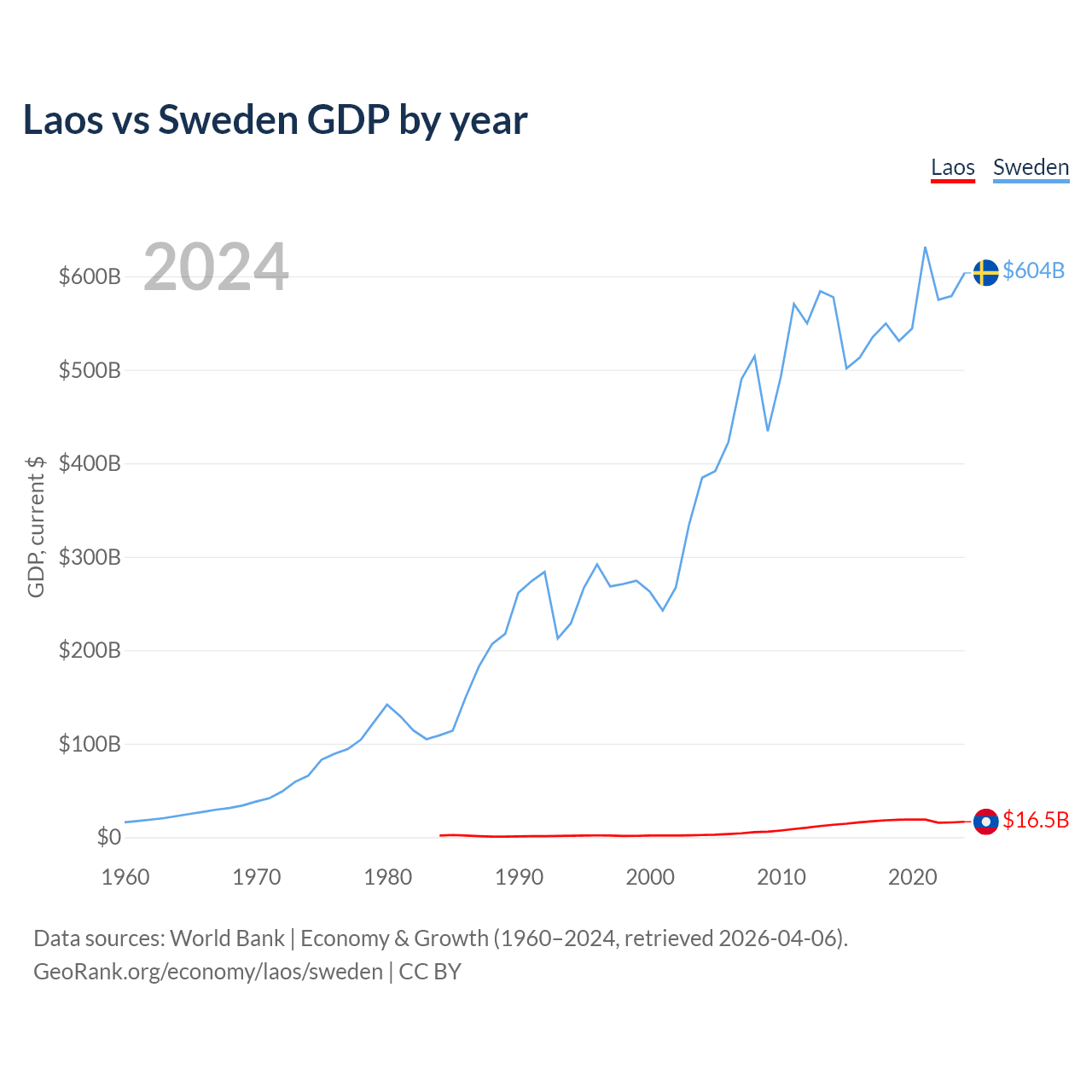 Laos has a GDP of $16.5B compared to $604B for Sweden, ranking 139/197 and 26/197 by economy size, respectively.