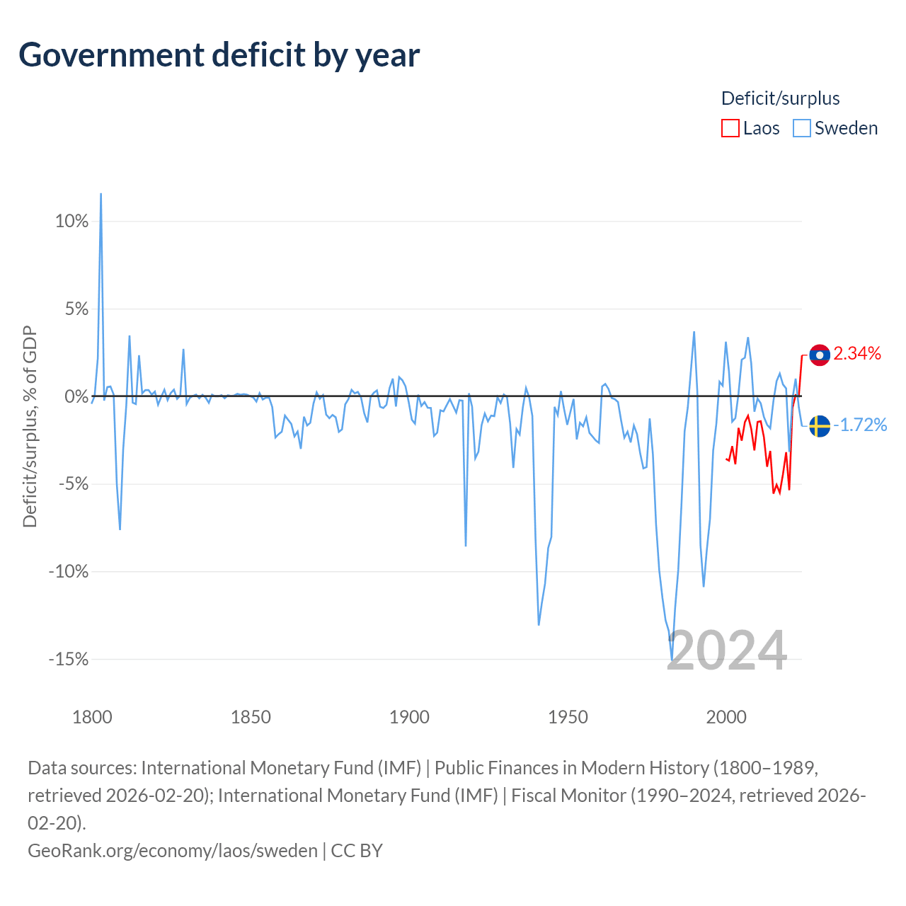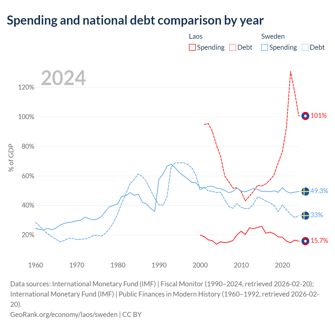 Laos has $16.6B in government debt (100.5% of GDP), compared to $199B (33% of GDP) in Sweden.