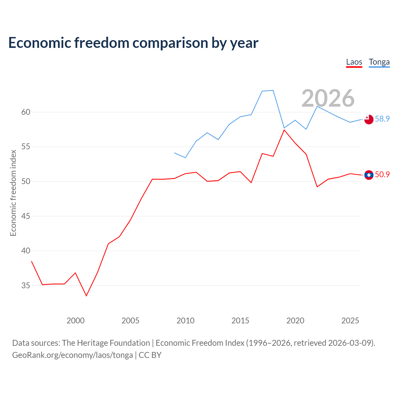 The Economic Freedom Index for Laos is 50.9, ranking 157/197, compared to 58.9 for Tonga, ranking 107/197. The chart above displays a comparison of annual changes in economic freedom indexes.