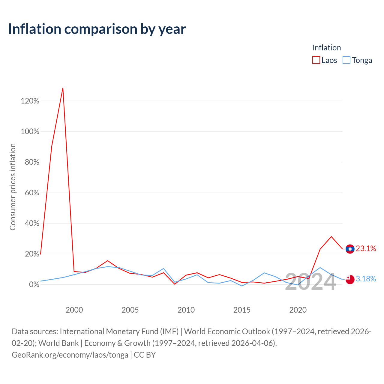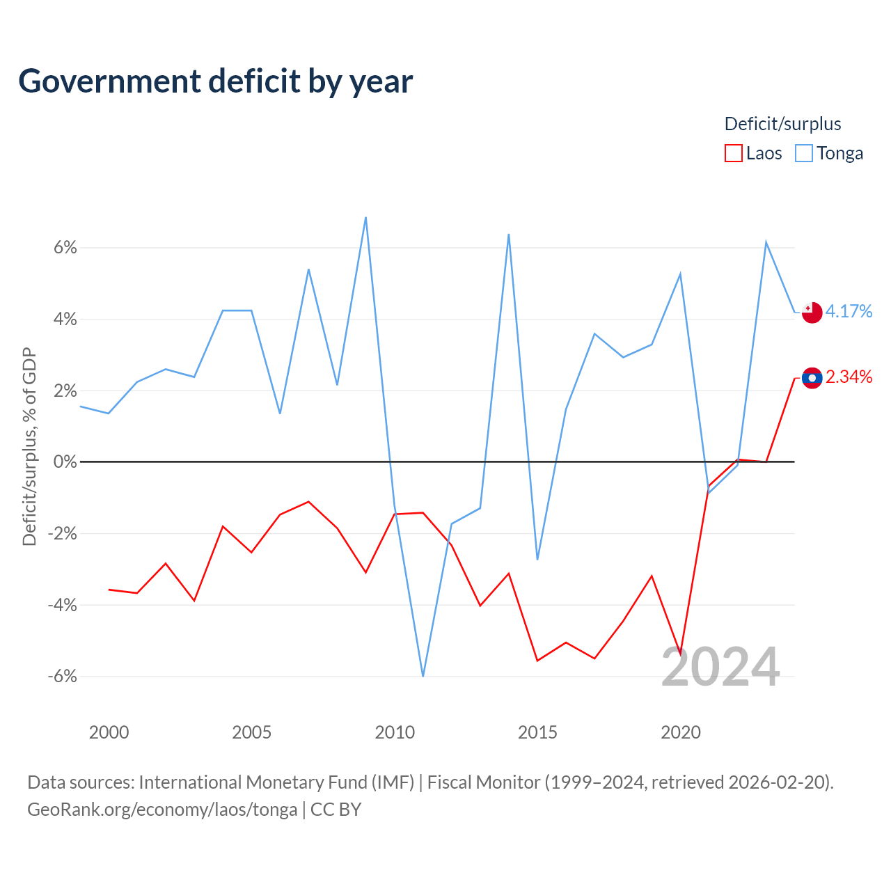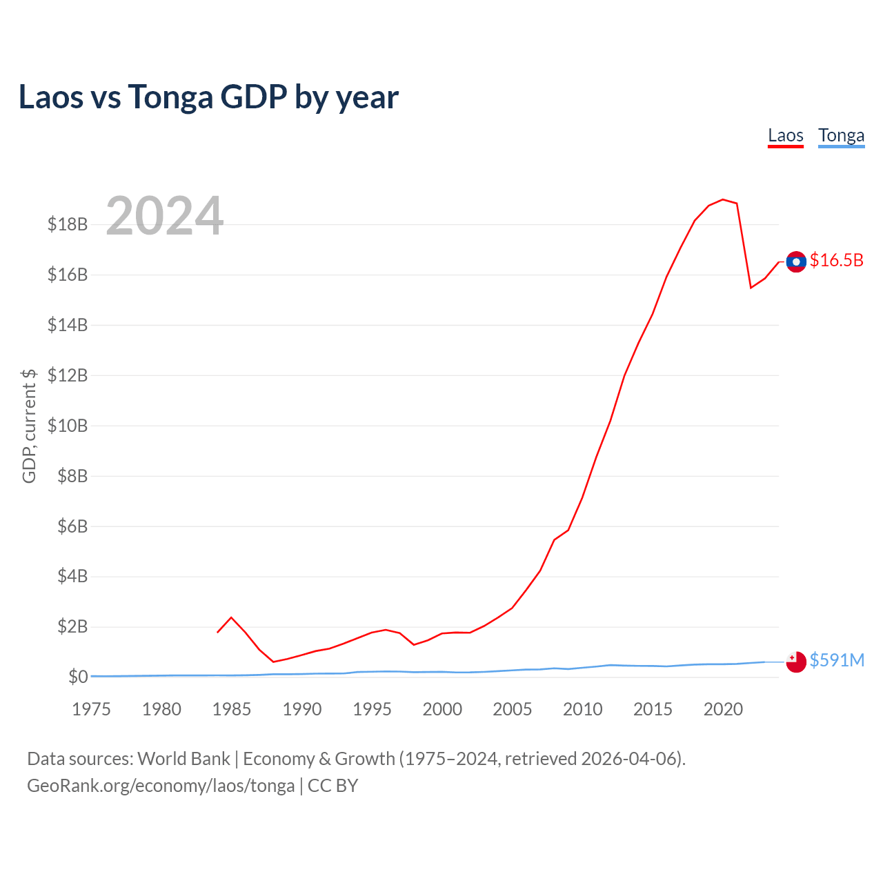 Laos has a GDP of $16.5B compared to $591M for Tonga, ranking 139/197 and 191/197 by economy size, respectively.