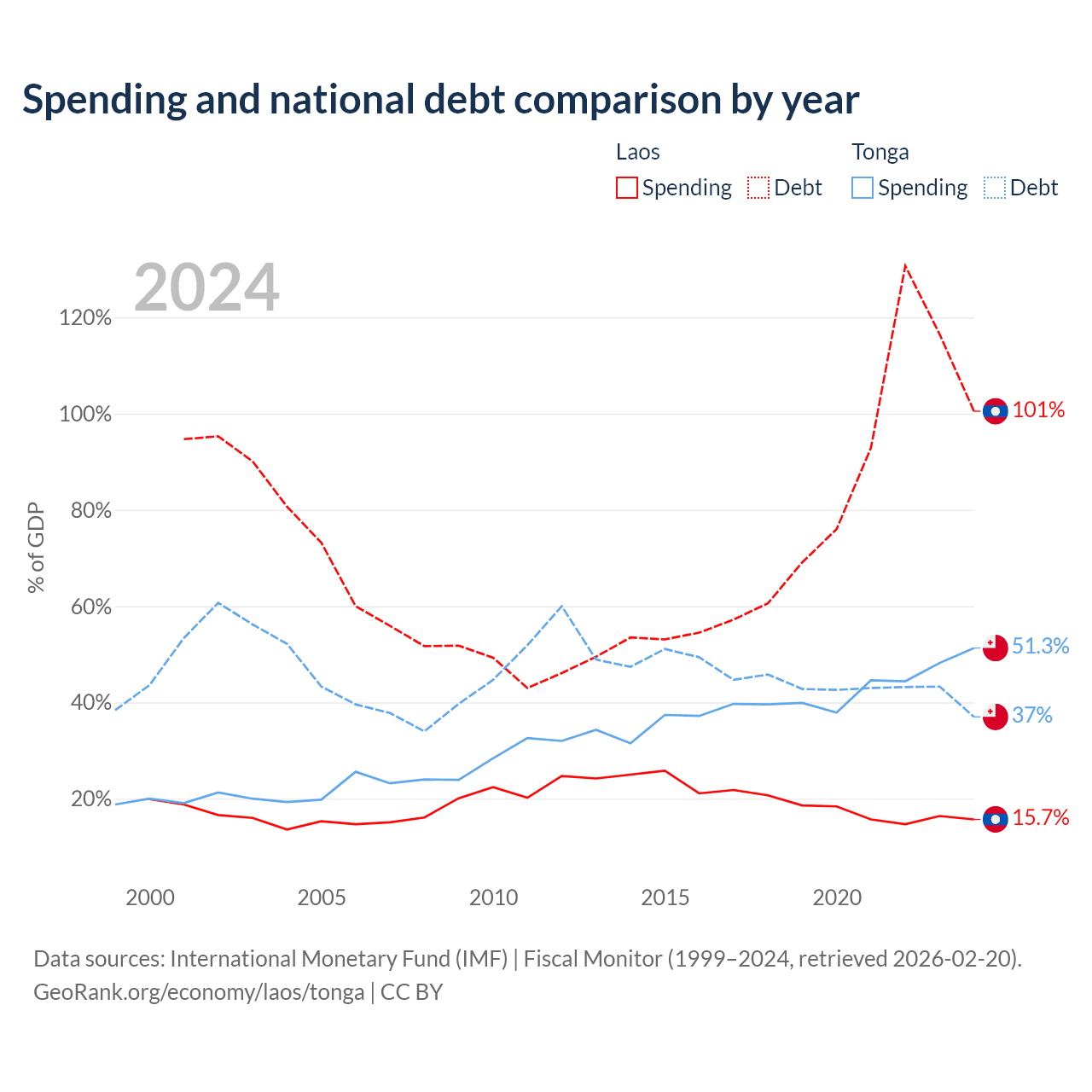 Laos has $16.6B in government debt (100.5% of GDP), compared to $256M (37% of GDP) in Tonga.