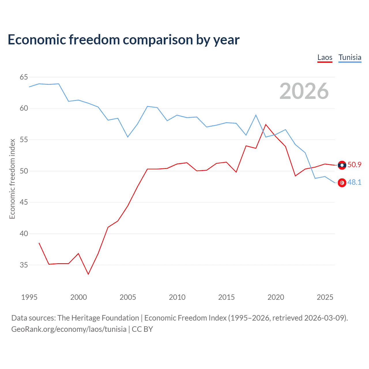 The Economic Freedom Index for Laos is 50.9, ranking 157/197, compared to 48.1 for Tunisia, ranking 172/197. The chart above displays a comparison of annual changes in economic freedom indexes.