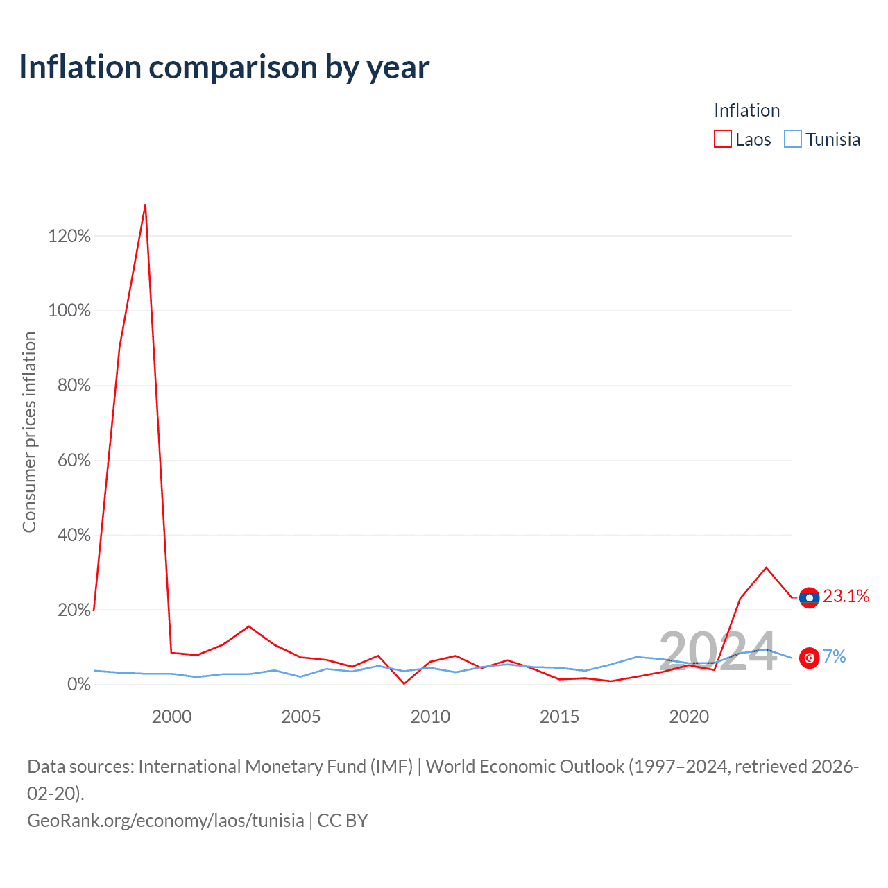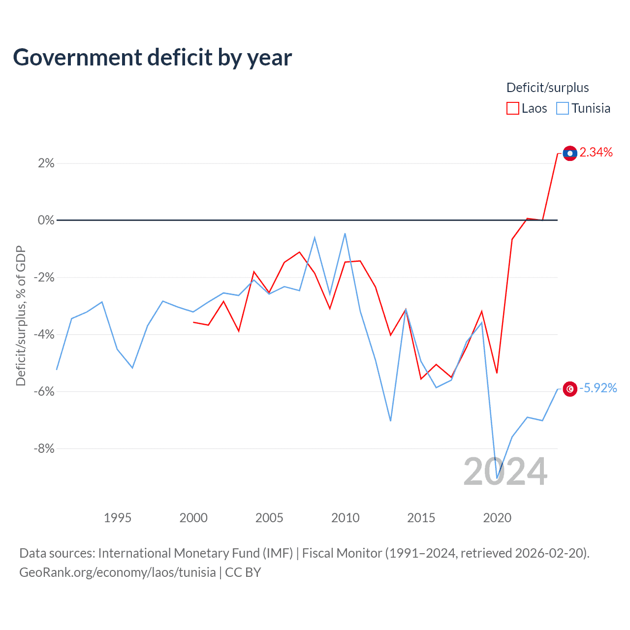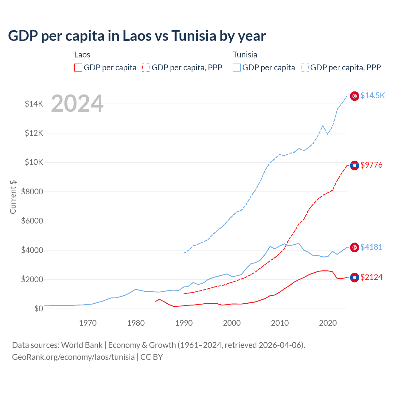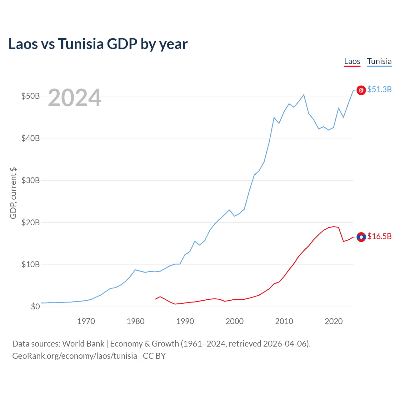 Laos has a GDP of $16.5B compared to $51.3B for Tunisia, ranking 139/197 and 93/197 by economy size, respectively.