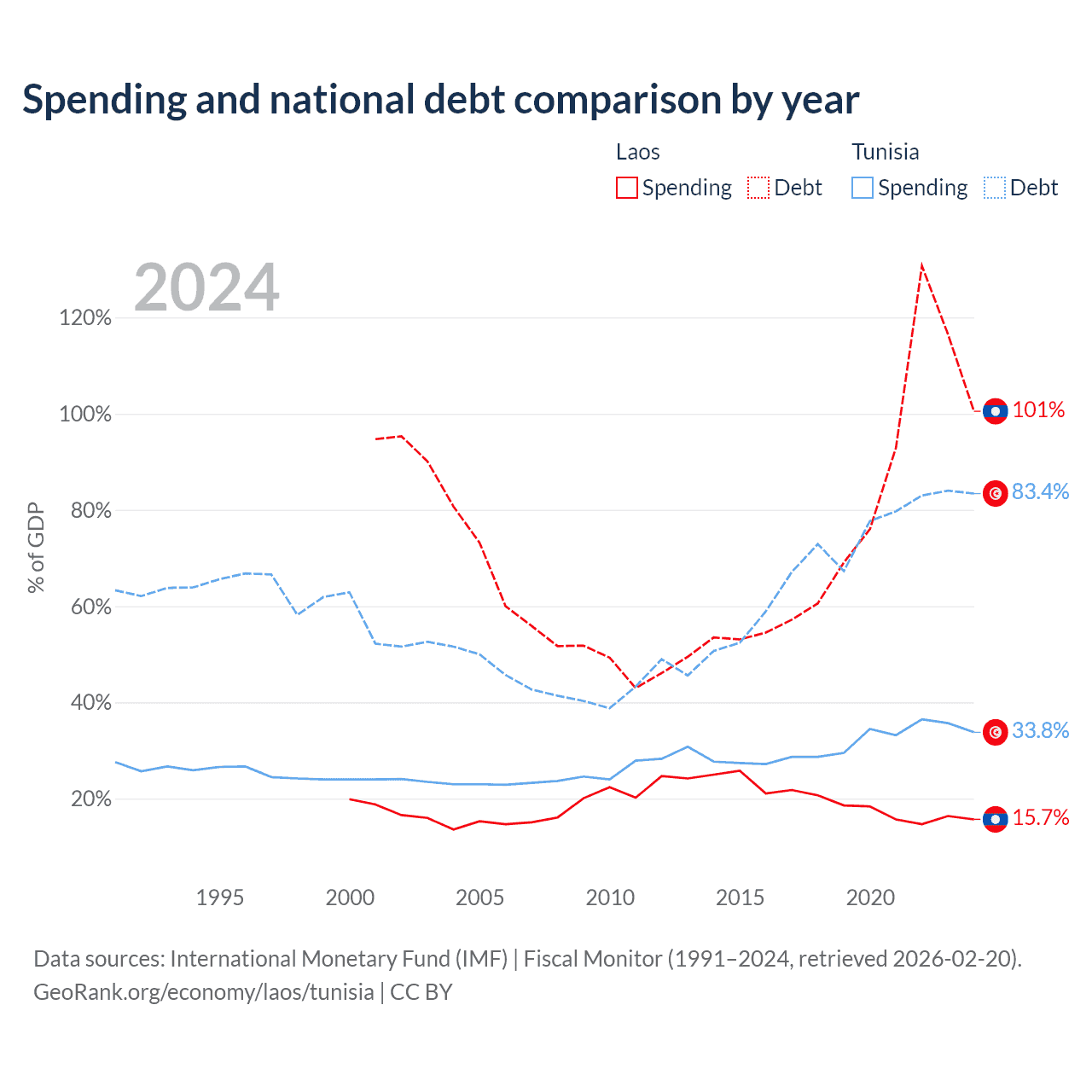 Laos has $16.6B in government debt (100.5% of GDP), compared to $42.8B (83.4% of GDP) in Tunisia.