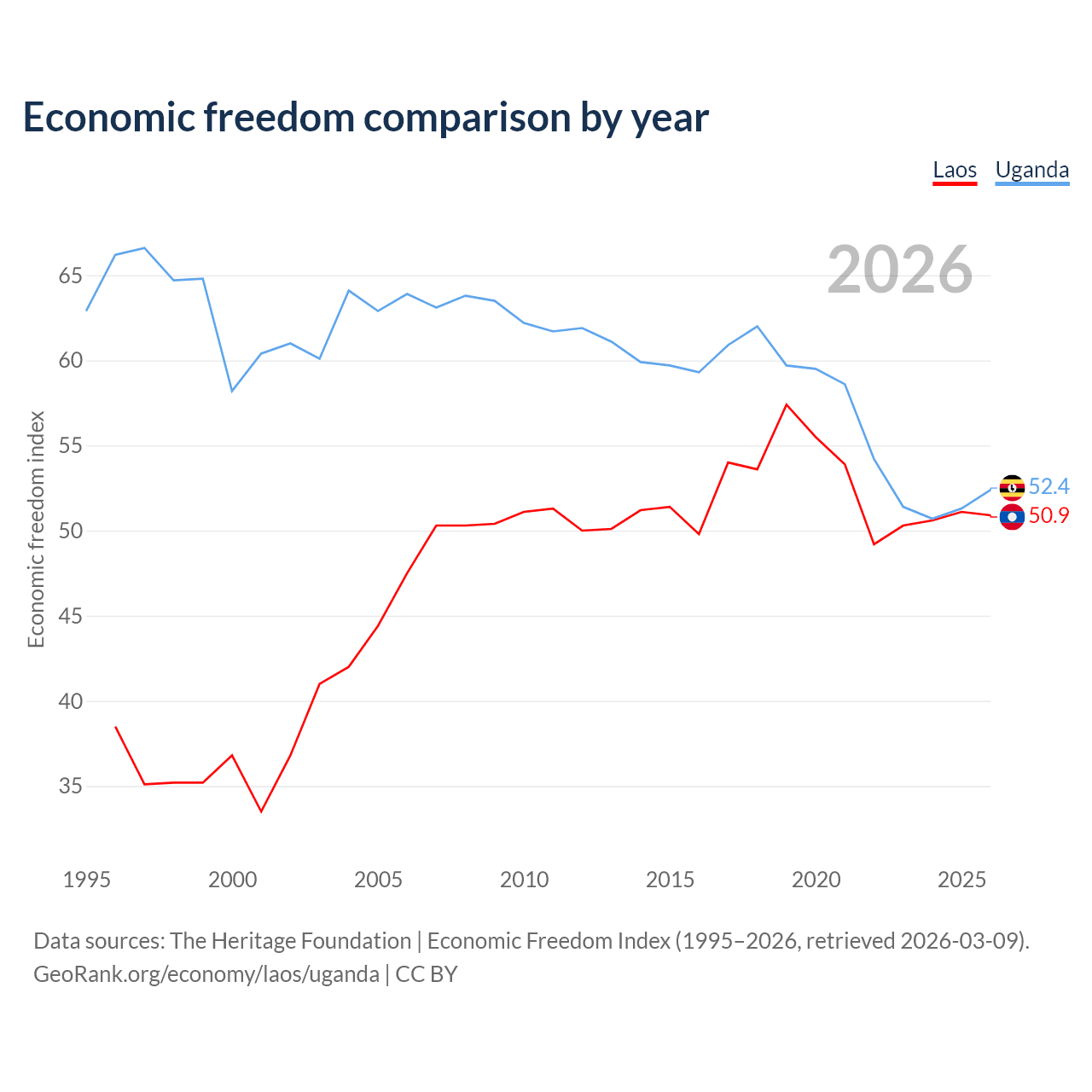 The Economic Freedom Index for Laos is 50.9, ranking 157/197, compared to 52.4 for Uganda, ranking 149/197. The chart above displays a comparison of annual changes in economic freedom indexes.