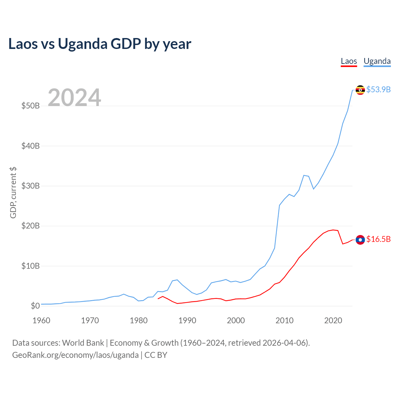 Laos vs Uganda GDP by year