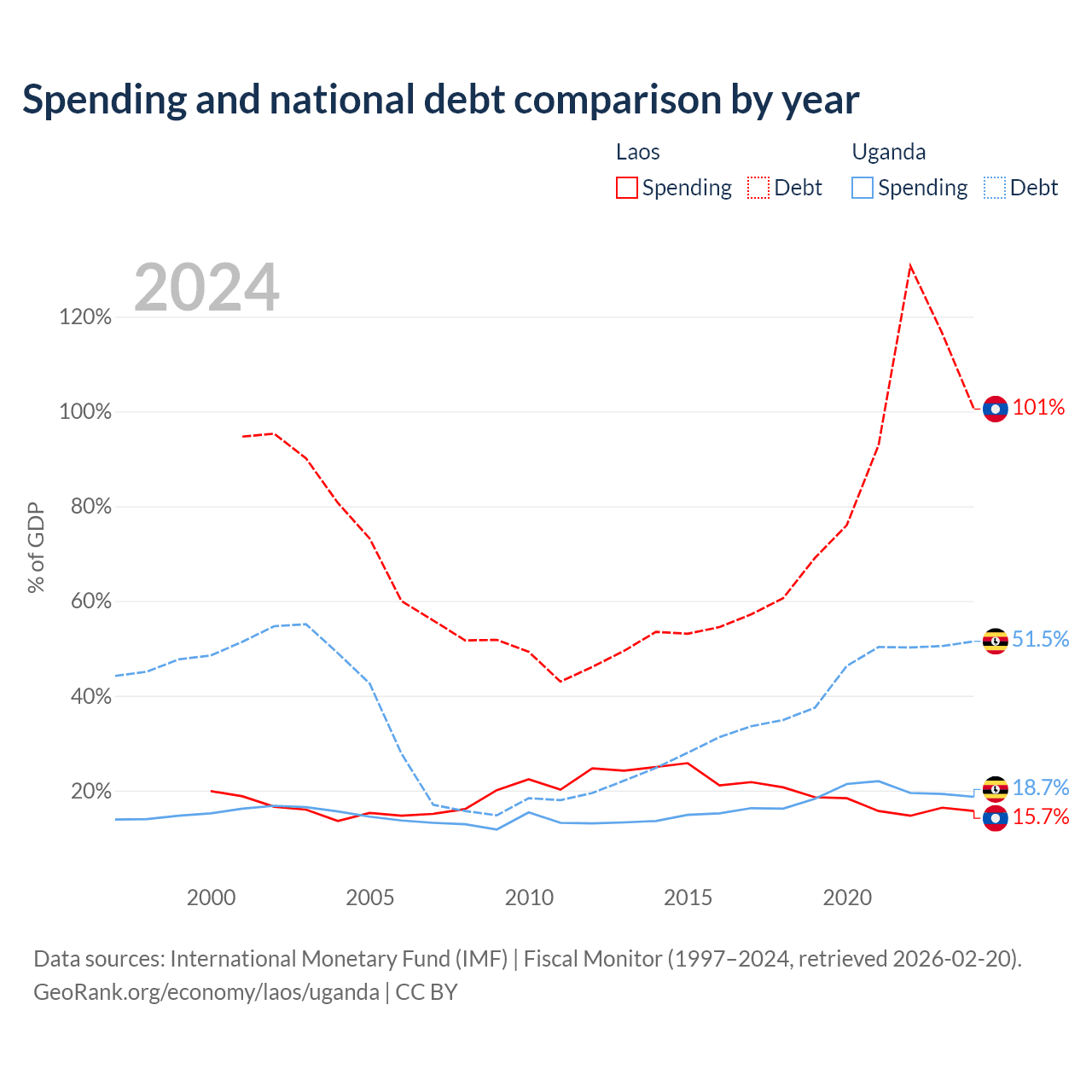 Laos has $16.6B in government debt (100.5% of GDP), compared to $27.8B (51.5% of GDP) in Uganda.